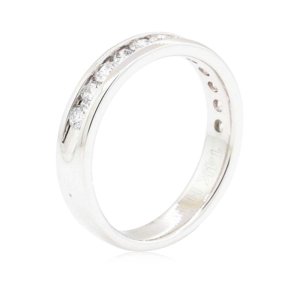 One band featuring: 14KT white gold weighing 3.3 grams containing diamonds weighing 0.50ctw. The ring is a size 5.5.