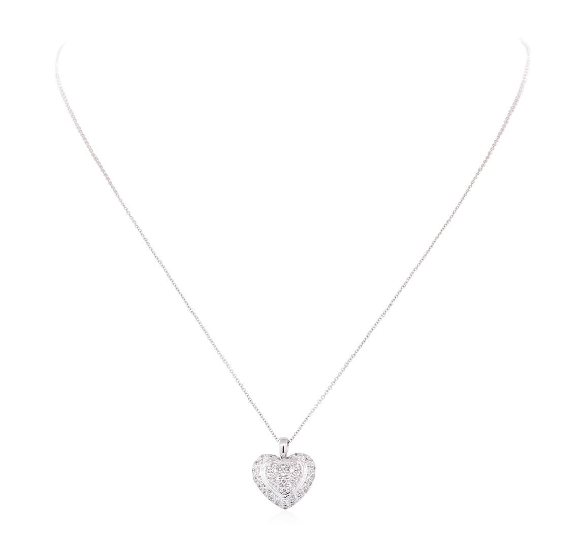 One heart shaped pendant with a sixteen inch long 1mm rounded cable link chain featuring: 14KT white gold weighing 4.5 grams containing diamonds weighing 0.50ctw.