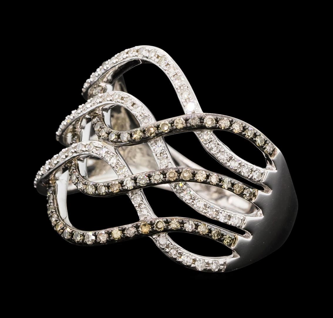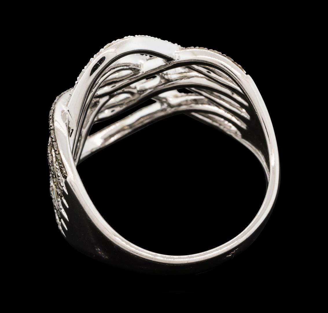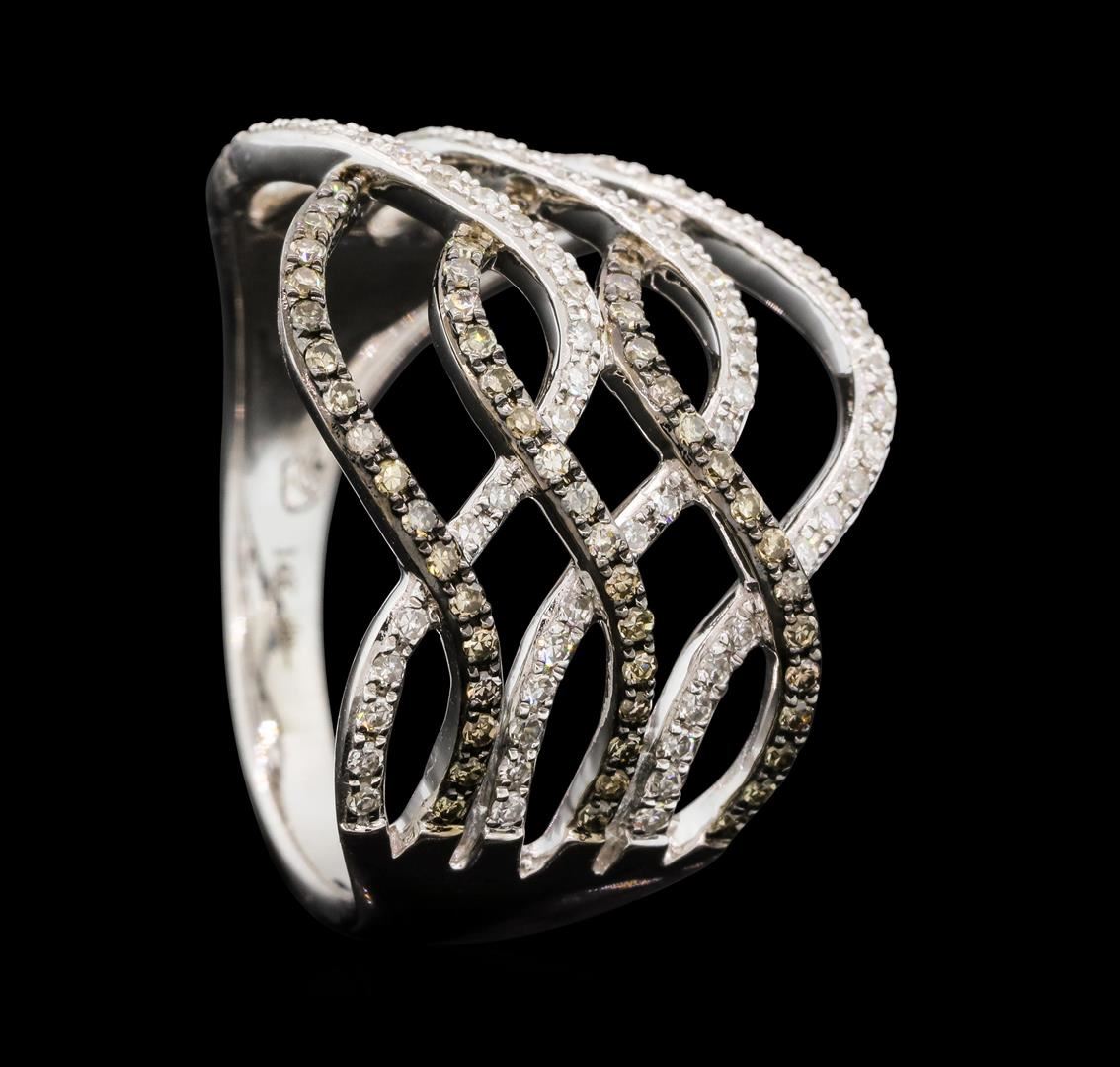 One electronically tested 14KT white gold lady's cast fashion ring with a wave motif wide band with a bright polish finish. The featured lady's ring has six overlapping waves and a shank measuring 2.65 millimeters wide. Identified with markings of "14K". Condition is new, good workmanship. Containing: Sixty-Nine prong set single cut diamonds, measuring 1.00. - 0.95 x 0.61mm (depth est.) approximate. Total Weight of 69 Stones = 0.25ct. Graded in the setting. Color H - I Clarity SI-1 to I-1 Cut Good Sixty-Nine prong set single cut diamonds, measuring 1.00. - 0.95 x 0.61mm (depth est.) approximate. Total Weight of 69 Stones = 0.25ct. Colored gemstones are presumed to have been subjected to commonly used enhancement processes. Graded in the setting. Color Fancy Light Brown-Clarity SI-1 to I-1 Cut Good. Total Weight of Diamonds 0.50ct.. Total Weight of Ring 5.00gm. GAS Appraised.