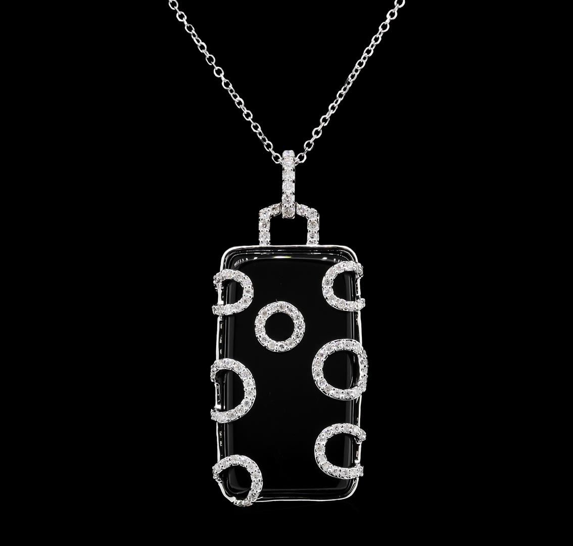 One lady's pendant and chain featuring: 14KT white gold weighing 6.8 grams containing one rectangular onyx and diamonds weighing 0.50ctw.