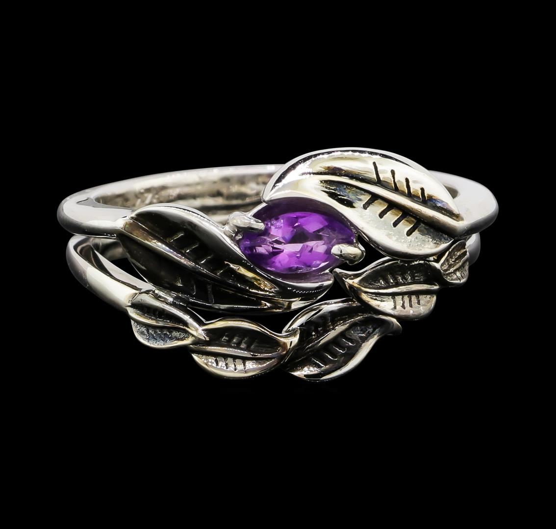 One lady's leaf motif ring featuring: 14KT white gold weighing 5.4 grams containing one amethyst weighing 0.50ct.