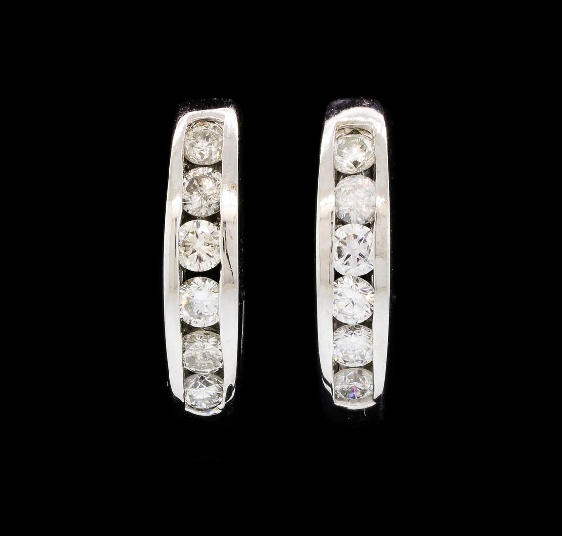 One pair of lady's huggie earrings featuring: 14KT white gold weighing 3.1 grams containing diamonds weighing 0.50ctw. The earrings have a diameter of approximately 15.5 millimeters.