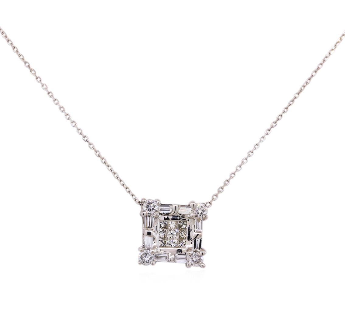 One electronically tested 14KT white gold lady's combination cast & assembled fashion necklace with a spring ring clasp with a bright polish finish. The featured lady's square diamond necklace has a.8mm diamond cut cable link measuring 16 inches in length. Identified with markings of "14K". Condition is new, good workmanship. Containing: Four prong set round brilliant cut diamonds, measuring 2.40 - 2.30 x 1.46mm (depth est.) approximate. Total Weight of 4 Stones = 0.20ct. Graded in the setting. Clarity: SI-1 to SI-2. Color: H - I, Cut Good Eight channel set baguette cut diamonds, measuring 2.10 x 1.10 x 0.94mm (depth est.) approximate. Total Weight of 8 Stones = 0.17ct. Graded in the setting. Clarity: VS-1 to VS-2. Color: G, Cut Good Nine invisible set princess cut diamonds, measuring 1.35 x 1.30 x 0.98mm (depth est.) approximate. Total Weight of 9 Stones = 0.13ct. Graded in the setting. Clarity: VS-2 to SI-1. Color: H - I, Cut Very Good. Total Weight of Diamonds 0.50ct. Total Weight of Necklace 2.10gm. GAS Appraised at $2,200.00.