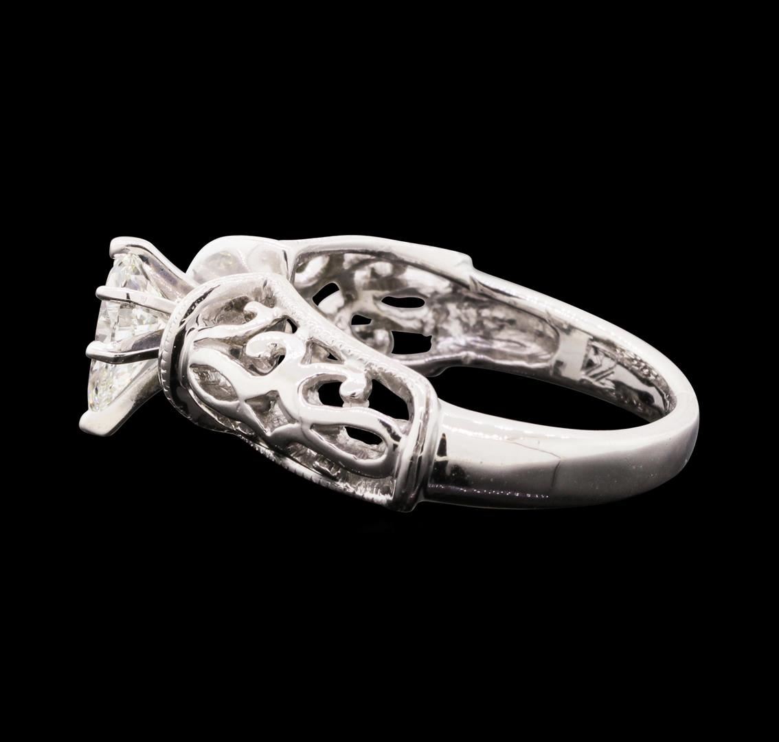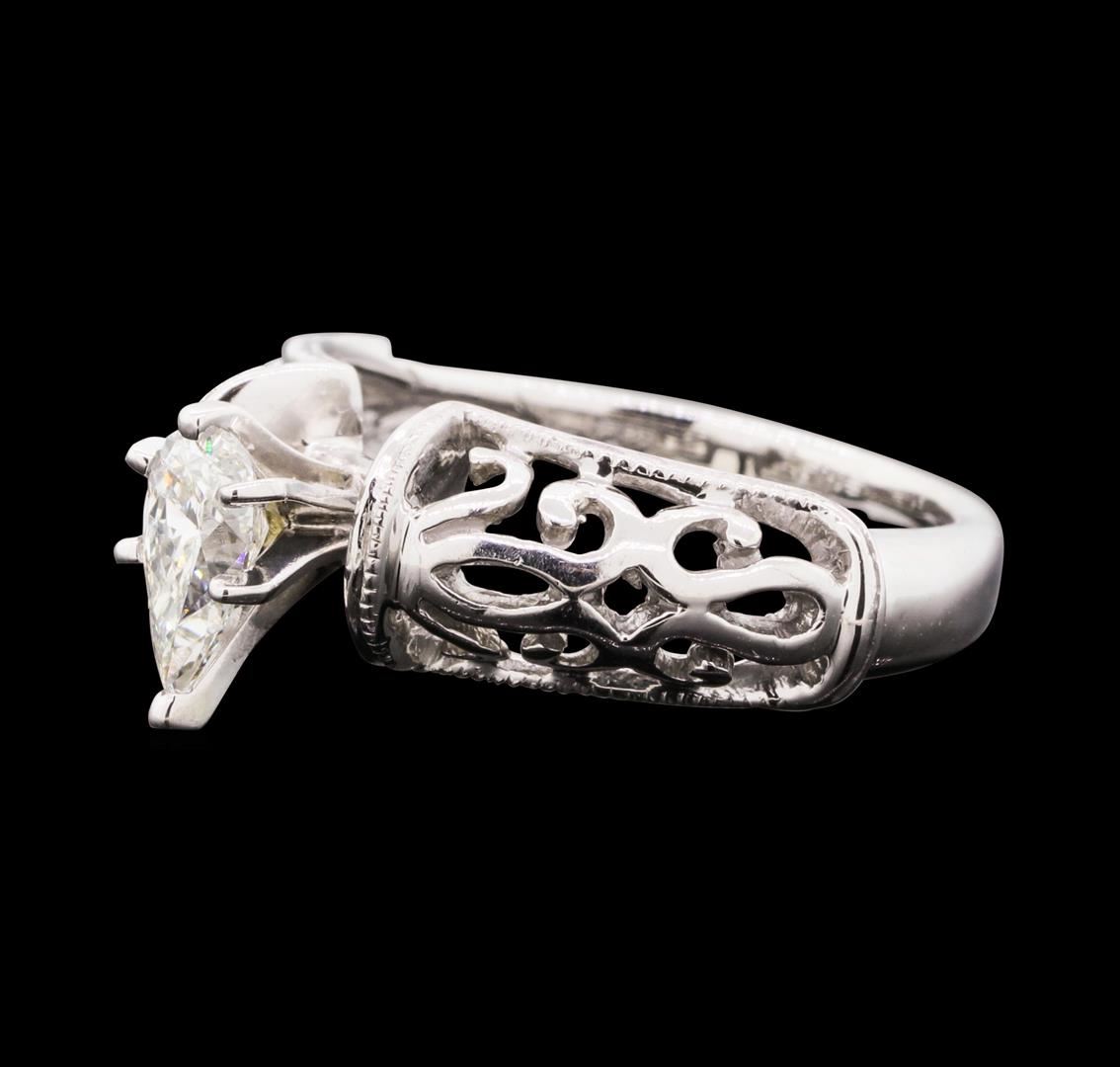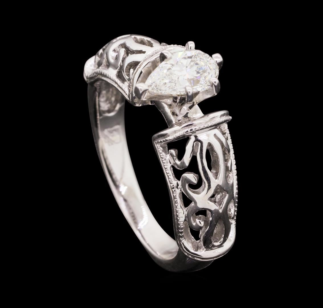 One electronically tested 14KT white gold lady's cast fashion solitaire ring with a half dome shank with a bright polish with milgrain detailing finish. The featured lady's ring has filigree detailing and a shank measuring 2.40 millimeters wide. Identified with markings of "14K". Condition is new, good workmanship. Containing: One prong set pear shaped cut diamond, measuring 6.90 x 4.12 x 3.15mm (depth est.) approximate weight of 0.52ct. Graded in the setting. Color JClarity SI-1 Cut Very Good. Total Weight of Diamonds 0.52ct. Total Weight of Ring 4.40gm. GAS Appraised.