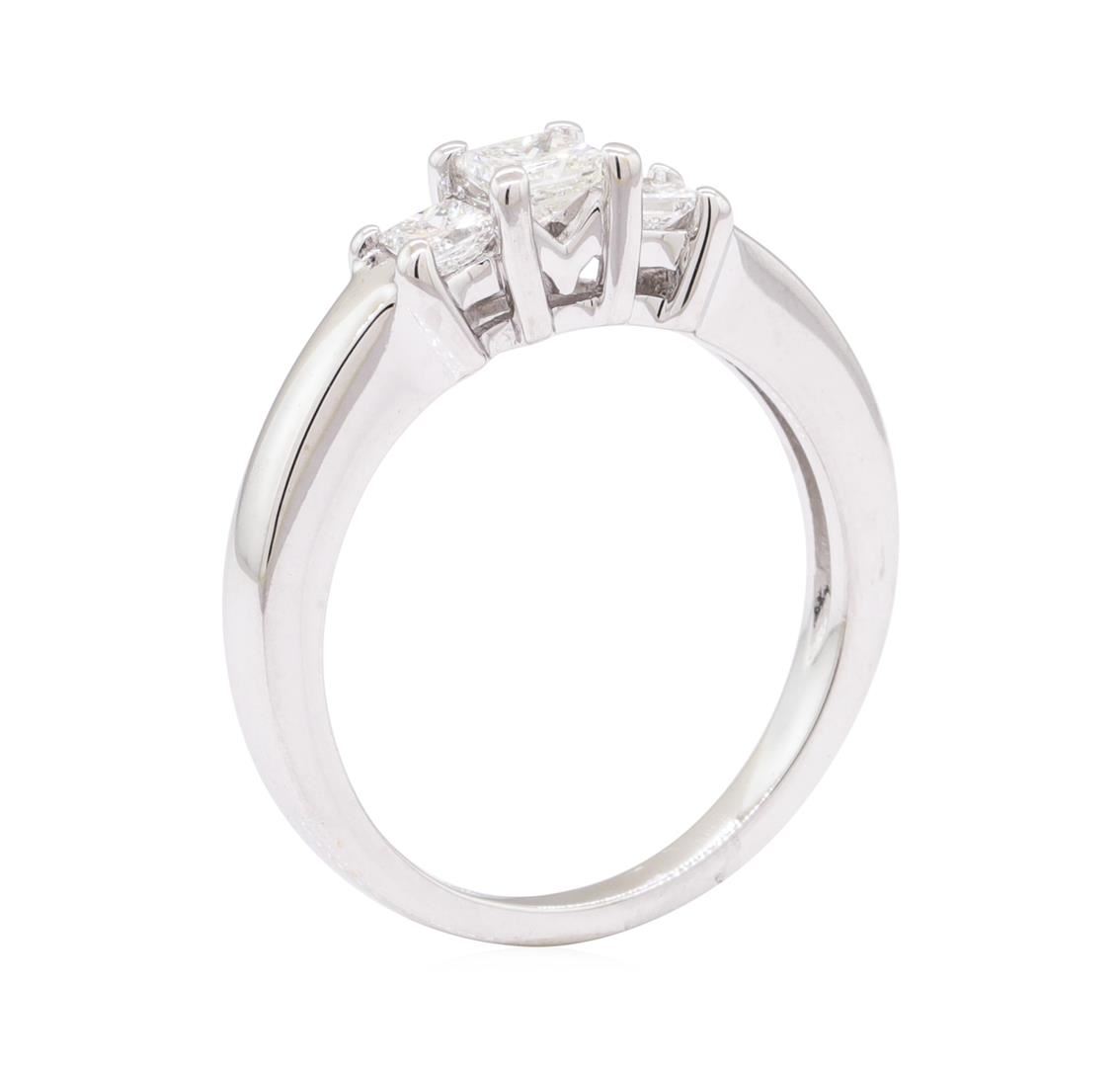 One electronically tested 14KT white gold lady's cast three stone ring with a bright polish finish. The featured lady's ring has a shank measuring 1.90 millimeters wide. Identified with markings of '14K'. Condition is new, good workmanship. Containing: One prong set princess cut diamond, measuring 3.40 x 3.30 x 2.57mm (depth est.) approximate weight of 0.25ct. Graded in the setting. Color H, Clarity VS-2, Cut Very Good Two prong set princess cut diamonds, measuring 2.90 x 2.80 x 2.10mm (depth est.) approximate total weight of 2 Stones = 0.30ct. Graded in the setting. Color H - I, Clarity VS-1 to VS-2, Cut Very Good. Total Weight of Diamonds 0.55ct. Total Weight of Ring 4.10gm. GAS Appraised.