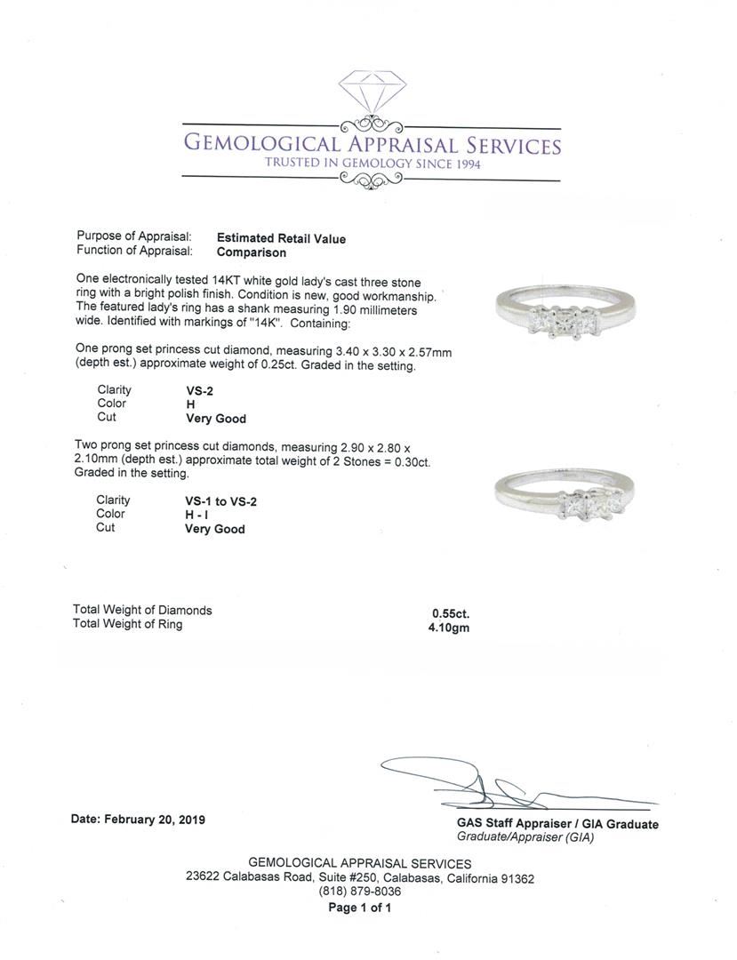 One electronically tested 14KT white gold lady's cast three stone ring with a bright polish finish. The featured lady's ring has a shank measuring 1.90 millimeters wide. Identified with markings of '14K'. Condition is new, good workmanship. Containing: One prong set princess cut diamond, measuring 3.40 x 3.30 x 2.57mm (depth est.) approximate weight of 0.25ct. Graded in the setting. Color H, Clarity VS-2, Cut Very Good Two prong set princess cut diamonds, measuring 2.90 x 2.80 x 2.10mm (depth est.) approximate total weight of 2 Stones = 0.30ct. Graded in the setting. Color H - I, Clarity VS-1 to VS-2, Cut Very Good. Total Weight of Diamonds 0.55ct. Total Weight of Ring 4.10gm. GAS Appraised.