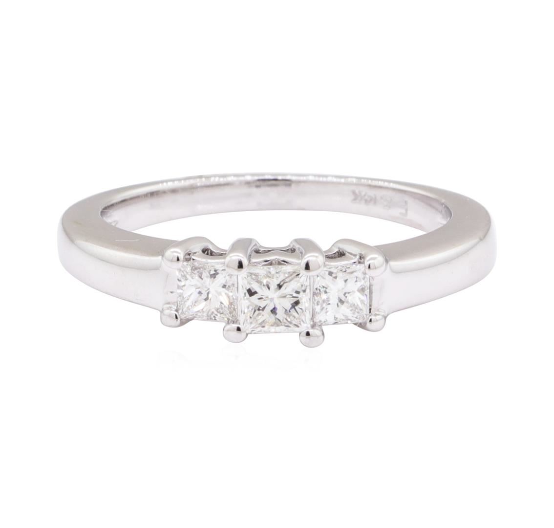 One electronically tested 14KT white gold lady's cast three stone ring with a bright polish finish. The featured lady's ring has a shank measuring 1.90 millimeters wide. Identified with markings of '14K'. Condition is new, good workmanship. Containing: One prong set princess cut diamond, measuring 3.40 x 3.30 x 2.57mm (depth est.) approximate weight of 0.25ct. Graded in the setting. Color H, Clarity VS-2, Cut Very Good Two prong set princess cut diamonds, measuring 2.90 x 2.80 x 2.10mm (depth est.) approximate total weight of 2 Stones = 0.30ct. Graded in the setting. Color H - I, Clarity VS-1 to VS-2, Cut Very Good. Total Weight of Diamonds 0.55ct. Total Weight of Ring 4.10gm. GAS Appraised.