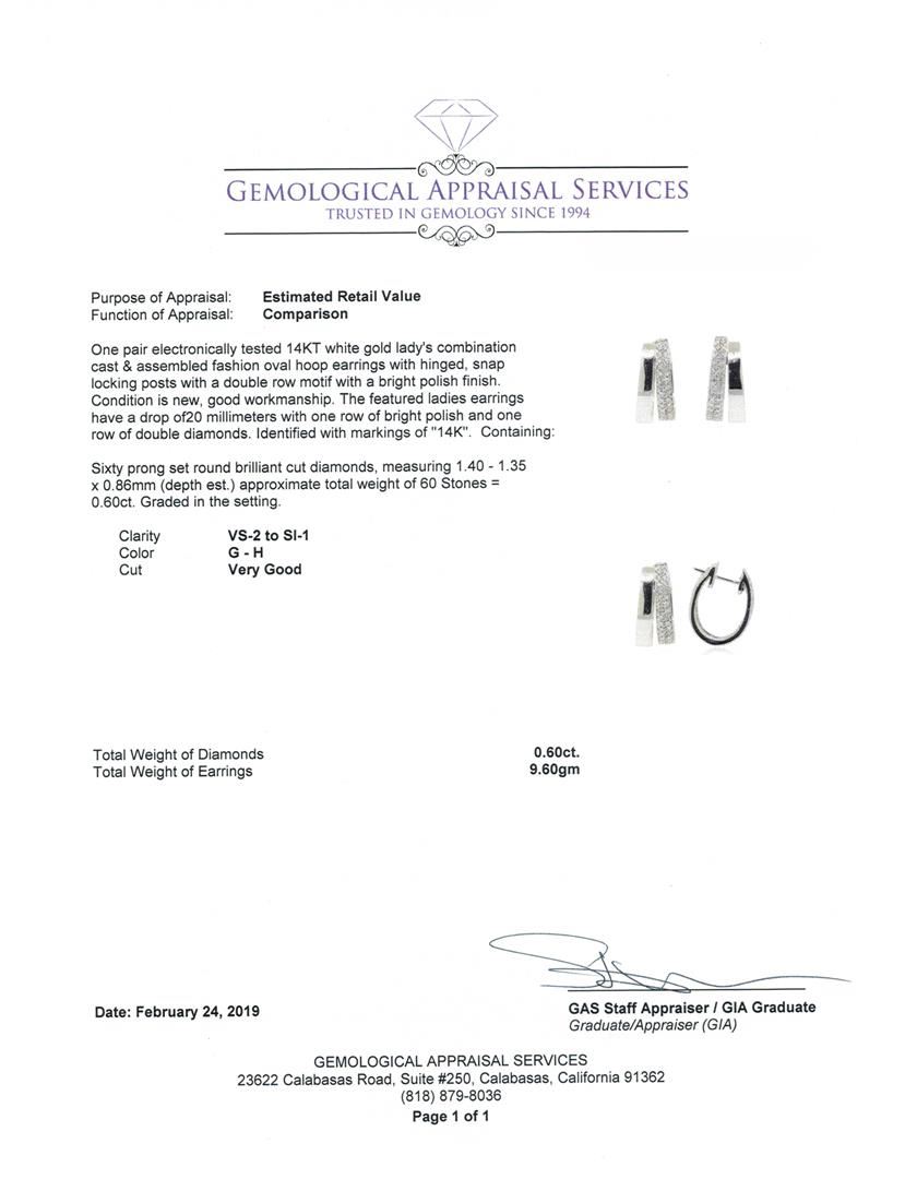 One pair electronically tested 14KT white gold lady's combination cast & assembled fashion oval hoop earrings with hinged, snap locking posts with a double row motif with a bright polish finish. The featured ladies earrings have a drop of20 millimeters with one row of bright polish and one row of double diamonds. Identified with markings of '14K'. Condition is new, good workmanship. Containing: Sixty prong set round brilliant cut diamonds, measuring 1.40 - 1.35 x 0.86mm (depth est.) approximate total weight of 60 Stones = 0.60ct. Graded in the setting. Color G - H, Clarity VS-2 to SI-1, Cut Very Good. Total Weight of Diamonds 0.60ct. Total Weight of Earrings 9.60gm. GAS Appraised.