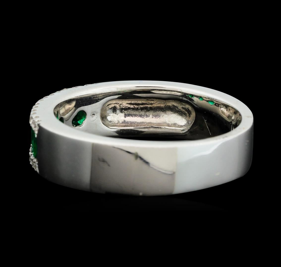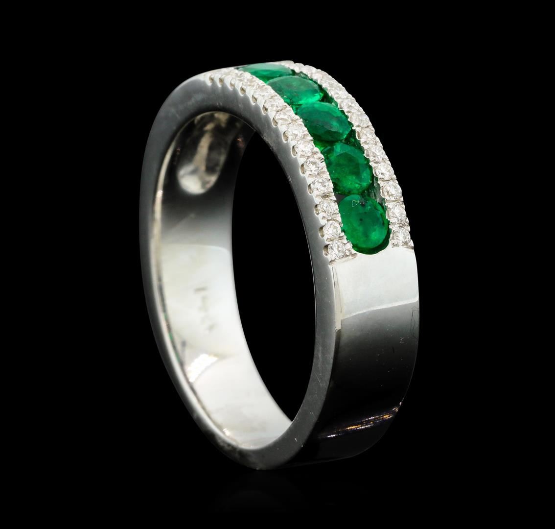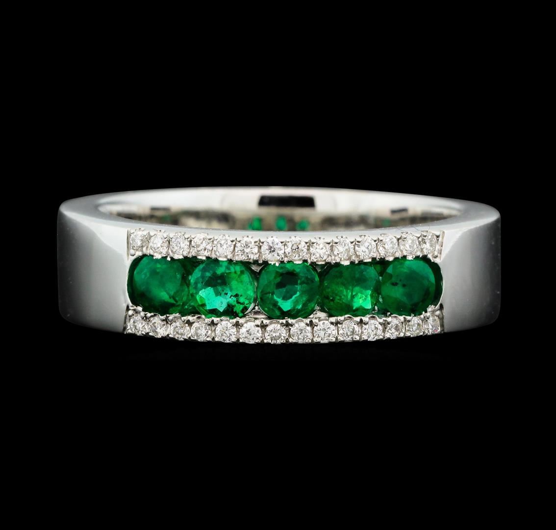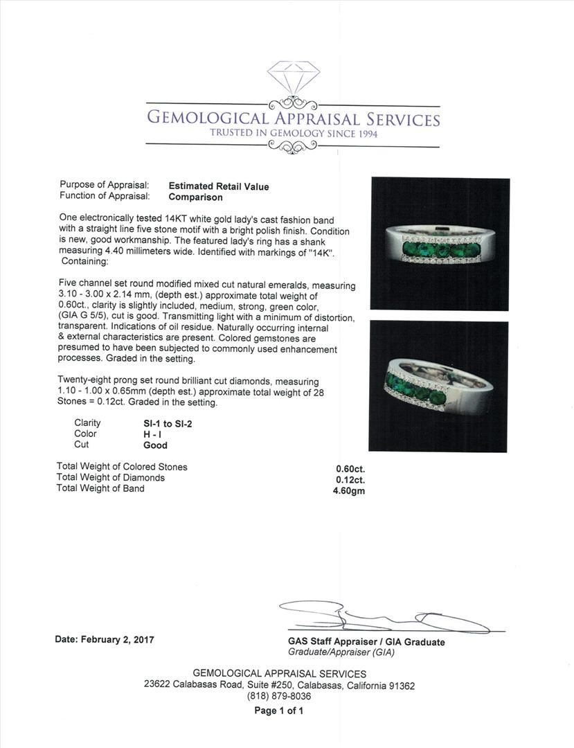 One electronically tested 14KT white gold lady's cast fashion band with a straight line five stone motif with a bright polish finish. The featured lady's ring has a shank measuring 4.40 millimeters wide. Identified with markings of "14K". Condition is new, good workmanship. Containing: Five channel set round modified mixed cut natural emeralds, measuring 3.10 - 3.00 x 2.14 mm, (depth est.) approximate total weight of 0.60ct., clarity is slightly included, medium, strong, green color, (GIA G 5/5), cut is good. Transmitting light with a minimum of distortion, transparent. Indications of oil residue. Naturally occurring internal & external characteristics are present. Colored gemstones are presumed to have been subjected to commonly used enhancement processes. Graded in the setting.Twenty-Eight prong set round brilliant cut diamonds, measuring 1.10 - 1.00 x 0.65mm (depth est.) approximate total weight of 28 Stones = 0.12ct. Graded in the setting. Clarity: SI-1 to SI-2. Color: H - ICut Good. Total Weight of Colored Stones 0.60ct. Total Weight of Diamonds 0.12ct. Total Weight of Band 4.60gm. GAS Appraised.