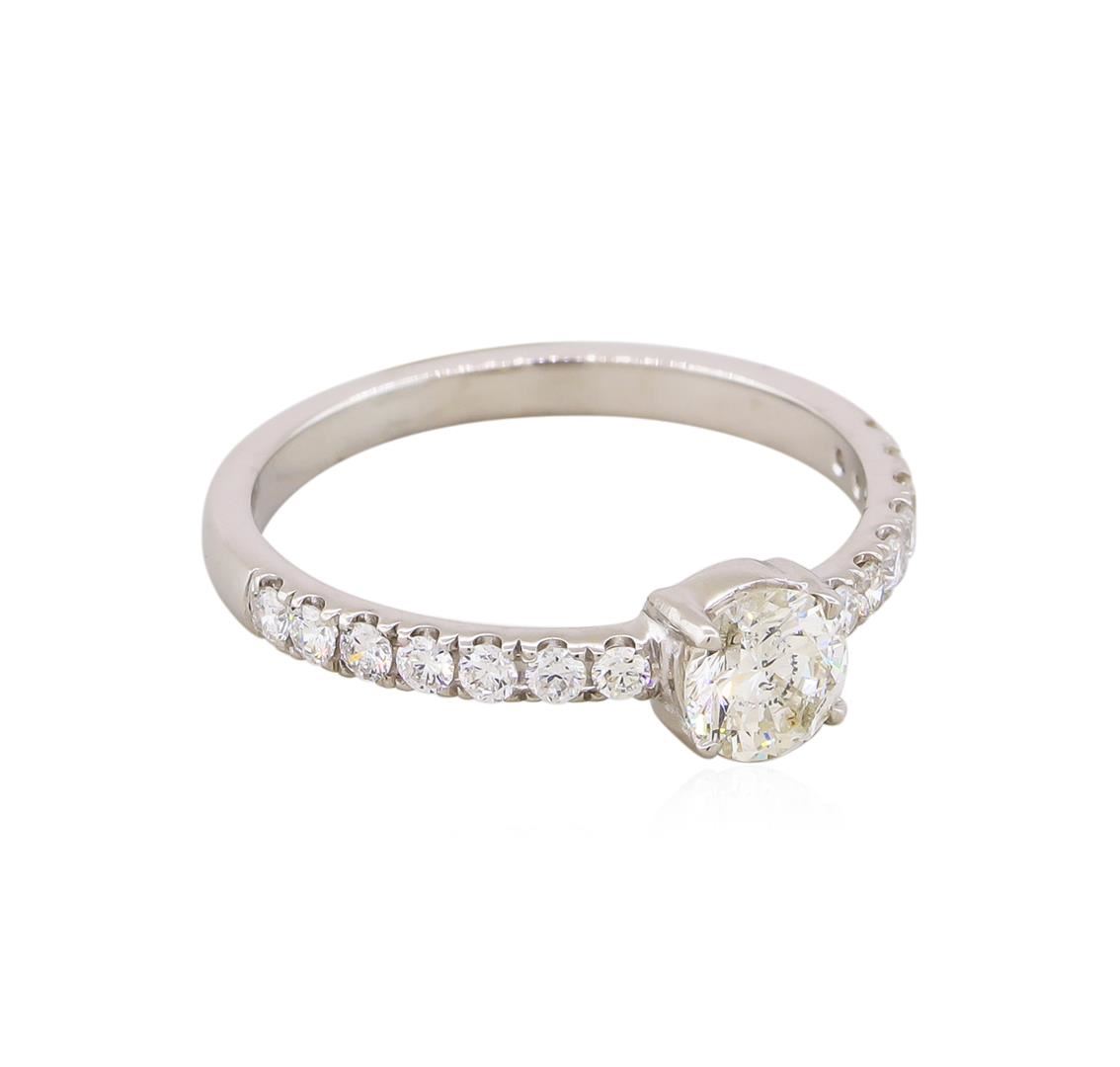One electronically tested 14KT white gold lady's cast wedding ring with a bright polish finish. The featured lady's ring has a shank measuring 1.85 millimeters wide. Identified with markings of "14K". Condition is new, good workmanship. Containing: One prong set round brilliant cut diamond, measuring 4.77 - 4.75 x 2.89mm (depth est.) approximate weight of 0.40ct. Graded in the setting. Clarity: SI-1. Color: I, Cut Very Good Fourteen shared prong set round brilliant cut diamonds, measuring 1.60 - 1.50 x 0.96mm (depth est.) approximate. Total Weight of 14 Stones = 0.20ct. Graded in the setting. Clarity: VS-1 to VS-2. Color: G - H, Cut Very Good. Total Weight of Diamonds 0.60ct. Total Weight of Ring 1.70 grams. GAS Appraised at $3,910.00.