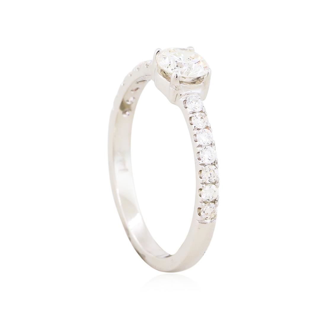 One electronically tested 14KT white gold lady's cast wedding ring with a bright polish finish. The featured lady's ring has a shank measuring 1.85 millimeters wide. Identified with markings of "14K". Condition is new, good workmanship. Containing: One prong set round brilliant cut diamond, measuring 4.77 - 4.75 x 2.89mm (depth est.) approximate weight of 0.40ct. Graded in the setting. Clarity: SI-1. Color: I, Cut Very Good Fourteen shared prong set round brilliant cut diamonds, measuring 1.60 - 1.50 x 0.96mm (depth est.) approximate. Total Weight of 14 Stones = 0.20ct. Graded in the setting. Clarity: VS-1 to VS-2. Color: G - H, Cut Very Good. Total Weight of Diamonds 0.60ct. Total Weight of Ring 1.70 grams. GAS Appraised at $3,910.00.