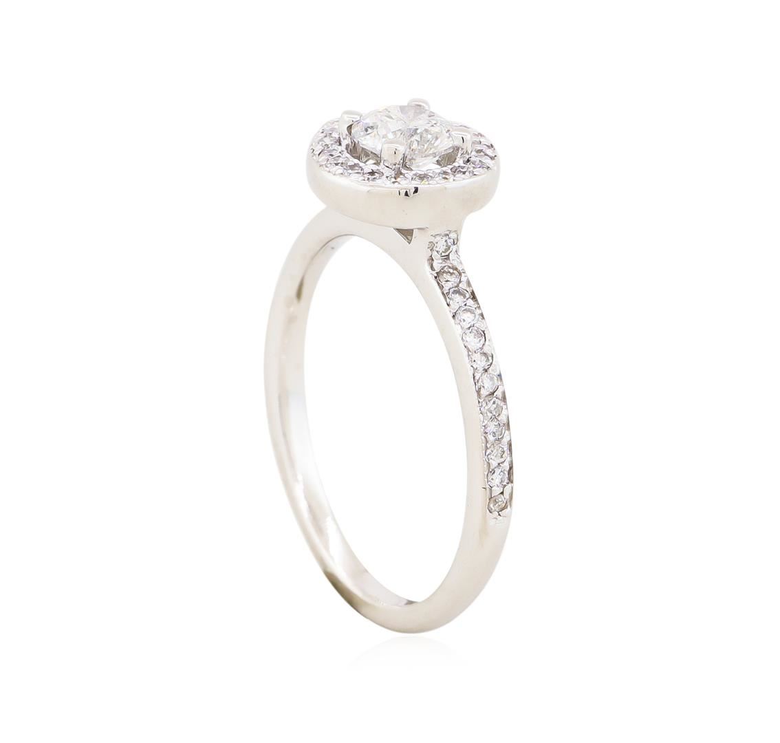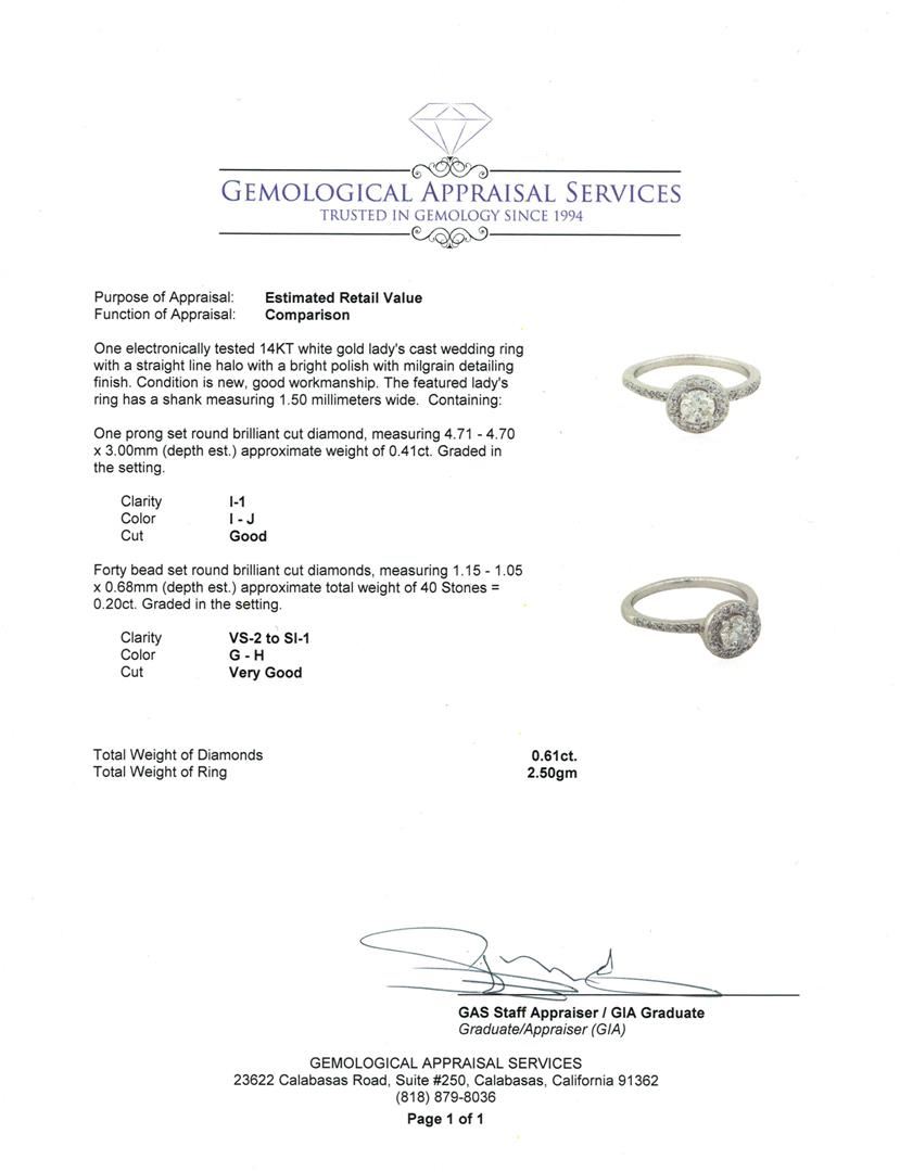 One electronically tested 14KT white gold lady's cast wedding ring with a straight line halo with a bright polish with milgrain detailing finish. The featured lady's ring has a shank measuring 1.50 millimeters wide. Condition is new, good workmanship. Containing: One prong set round brilliant cut diamond, measuring 4.71 - 4.70 x 3.00mm (depth est.) approximate weight of 0.41ct. Graded in the setting. Clarity: I-1. Color: I - J, Cut Good. Forty bead set round brilliant cut diamonds, measuring 1.15 - 1.05 x 0.68mm (depth est.) approximate. Total Weight of 40 Stones = 0.20ct. Graded in the setting. Clarity: VS-2 to SI-1. Color: G - H, Cut Very Good. Total Weight of Diamonds 0.61ct. Total Weight of Ring 2.50 grams. GAS Appraised.