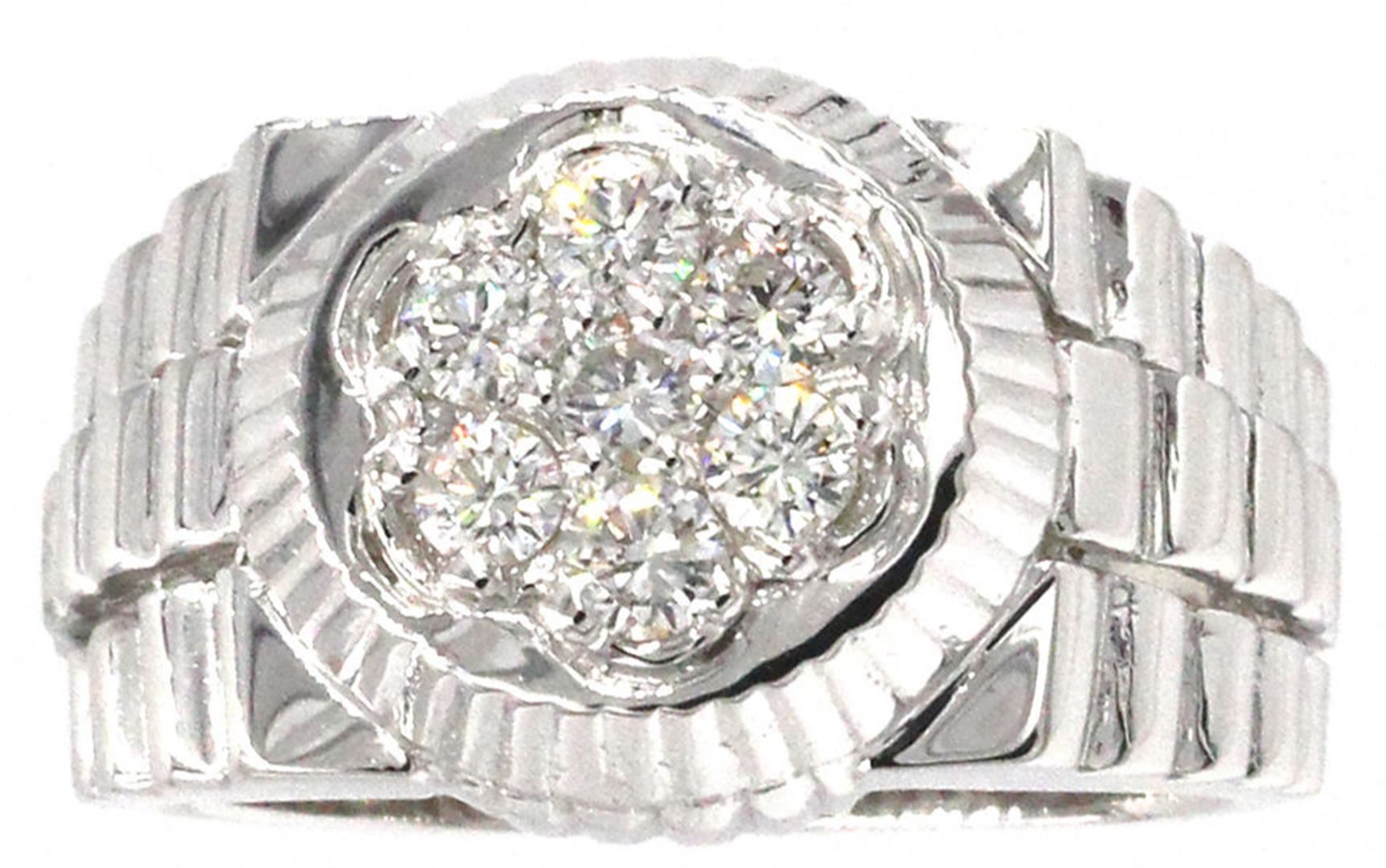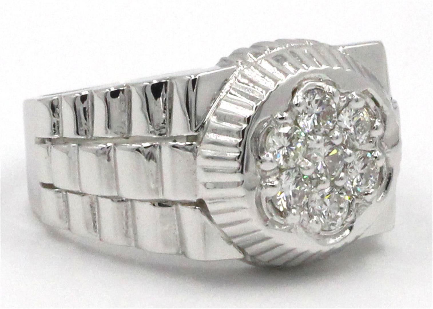 One Men's Round Brilliant Cut Diamond in 14k White Gold. The ring shank is thick with a 4 prong setting. Ring is size 8.75 but can be resized free of charge. Condition is brand new. Total carat weight is 0.62 grams. Gross weight is 8.30 grams. Main stone is not enhanced and natural. Main diamond shape is brilliant round cut, 0.62 carats, clarity SI1, color G-H, with an excellent cut. Total of seven diamonds.