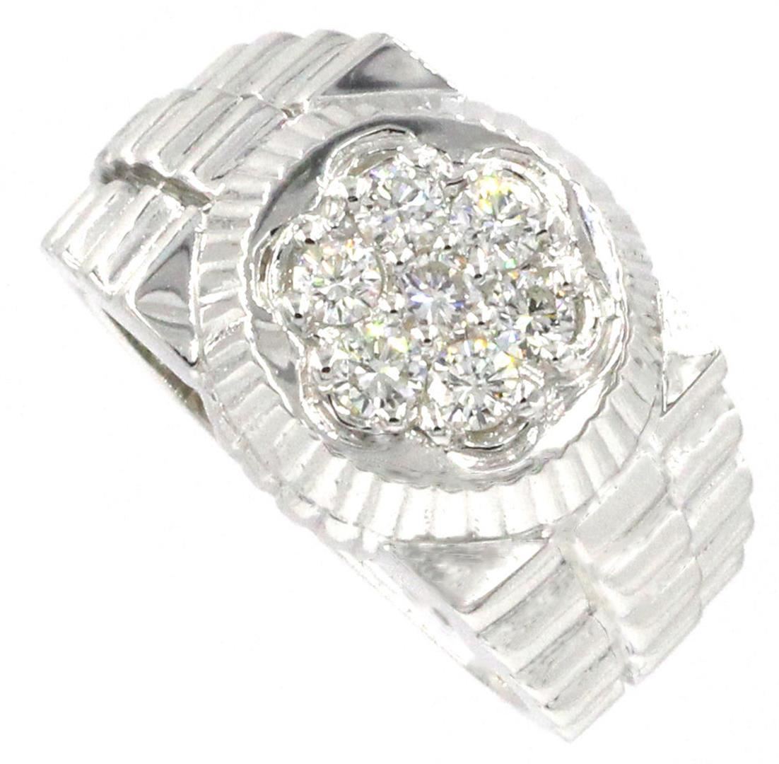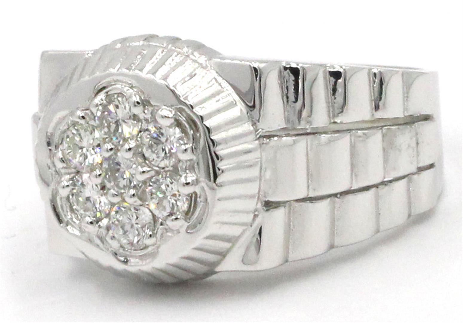 One Men's Round Brilliant Cut Diamond in 14k White Gold. The ring shank is thick with a 4 prong setting. Ring is size 8.75 but can be resized free of charge. Condition is brand new. Total carat weight is 0.62 grams. Gross weight is 8.30 grams. Main stone is not enhanced and natural. Main diamond shape is brilliant round cut, 0.62 carats, clarity SI1, color G-H, with an excellent cut. Total of seven diamonds.