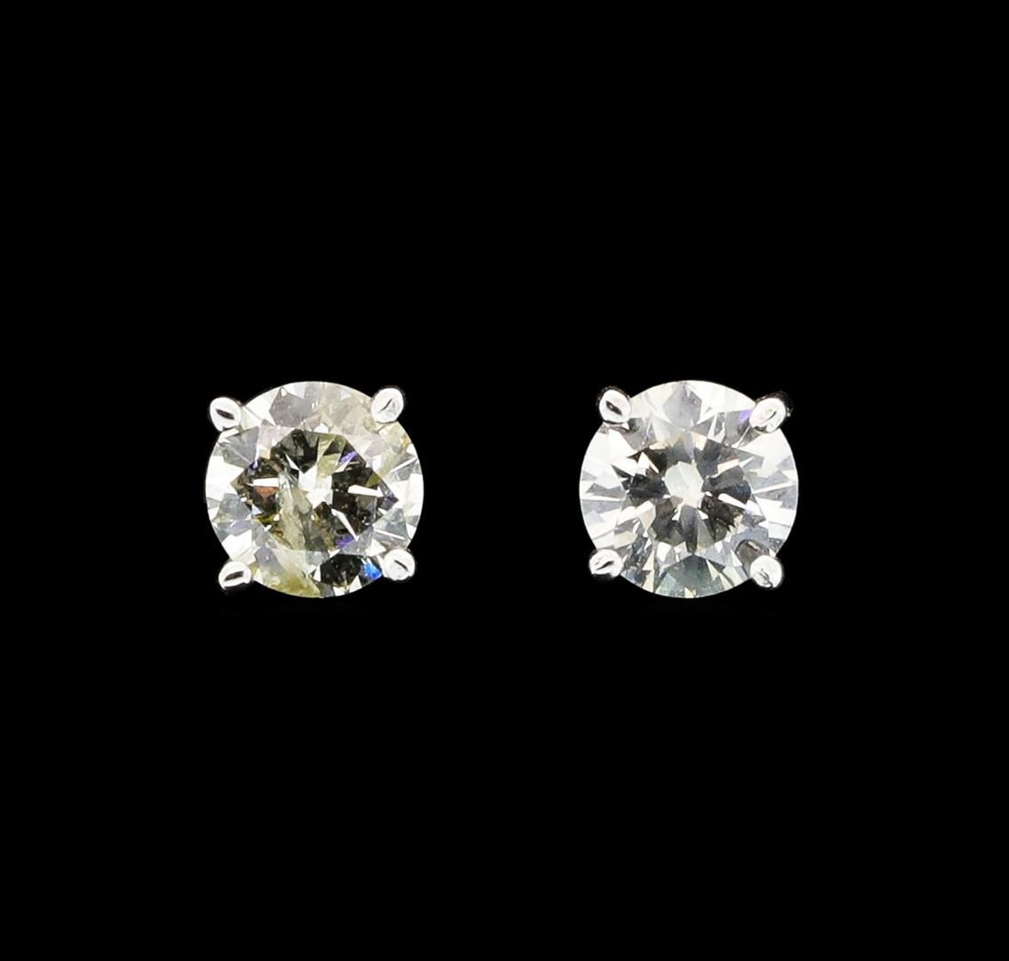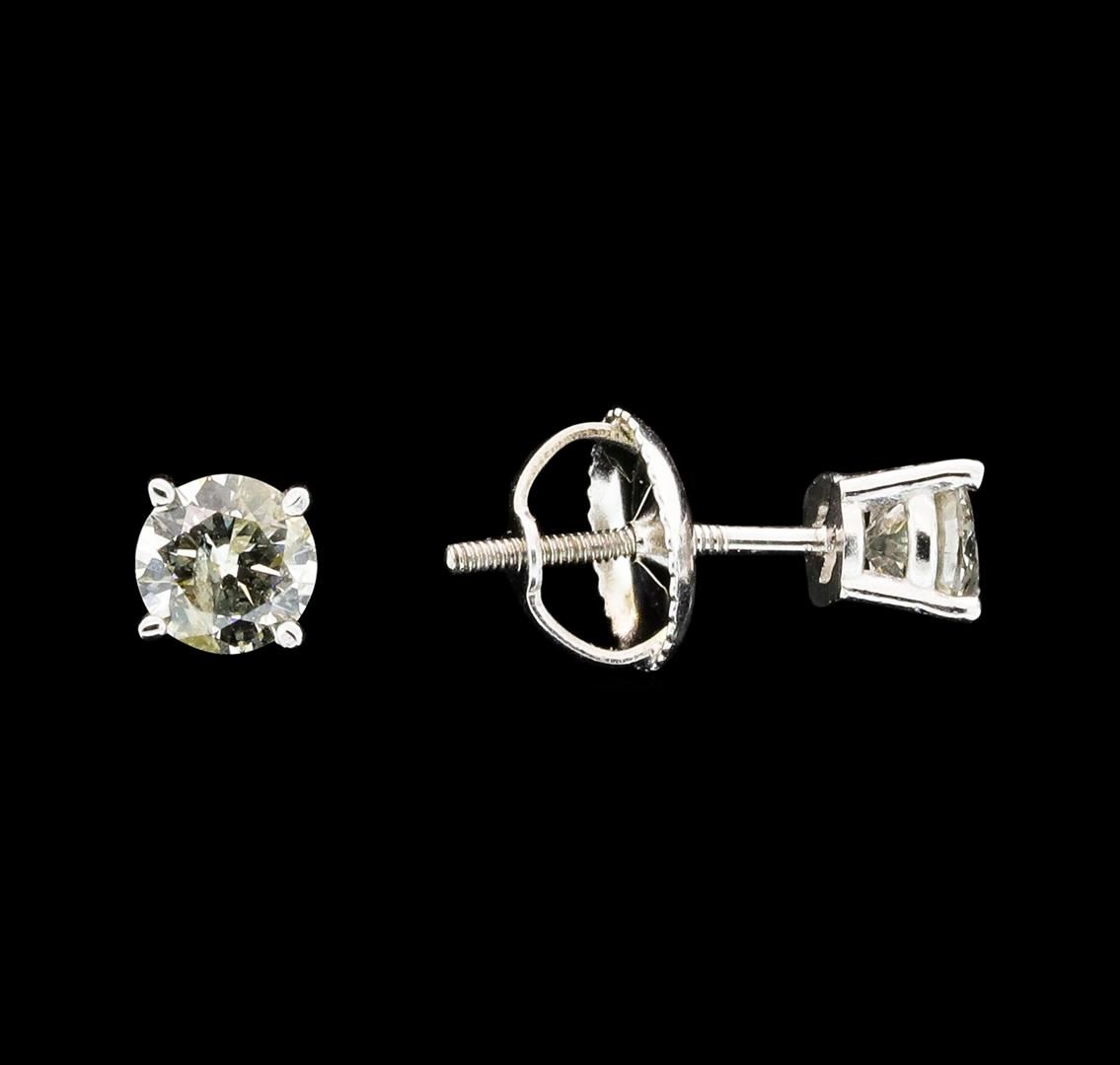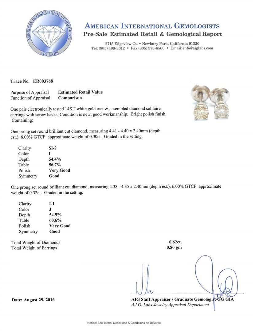 One pair electronically tested 14KT white gold cast & assembled diamond solitaire earrings with screw backs. Bright polish finish. Condition is new, good workmanship. Containing: One prong set round brilliant cut diamond, measuring 4.41 - 4.40 x 2.40mm (depth est.), 6.00.%. GTCF approximate weight of 0.30ct. Graded in the setting. Clarity: SI-2. Color: IDepth 54.4%. Table 56.7%. One prong set round brilliant cut diamond, measuring 4.38 - 4.35 x 2.40mm (depth est.), 6.00.%. GTCF approximate weight of 0.32ct. Graded in the setting. Clarity: I-1. Color: JDepth 54.9%. Table 60.6%. Total Weight of Diamonds 0.62ct. Total Weight of Earrings 0.80gm. AIG Appraised.