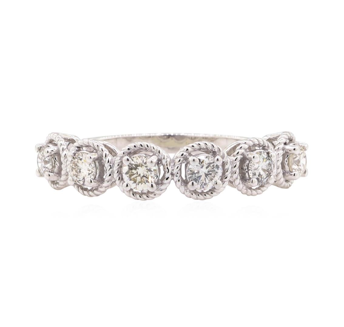 One ring with milgrain detailing featuring: 14KT white gold weighing 2.5 grams containing diamonds weighing 0.63ctw. The ring is a size 7.