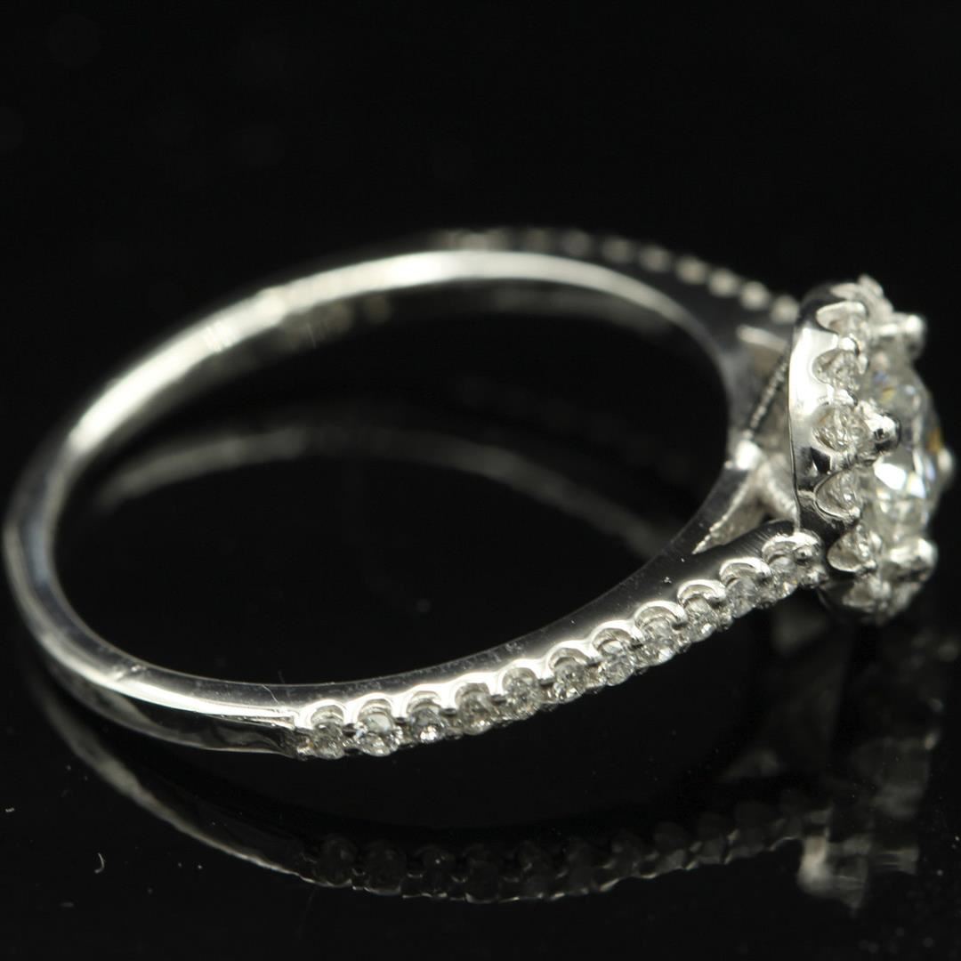 One Untreated Diamond Solitaire Engagement Ring with 14k White Gold. Gross weight is 1.81 grams. Total carat weight is 0.63 carats. Condition is brand new. Size 5.5 but can be resized free of charge. Main stone is 0.42 carats, color G-H, clarity SI2, and has round cut shape. Side stone is 0.21 carats, color G-H, clarity SI2 with a total of 38 stones.
