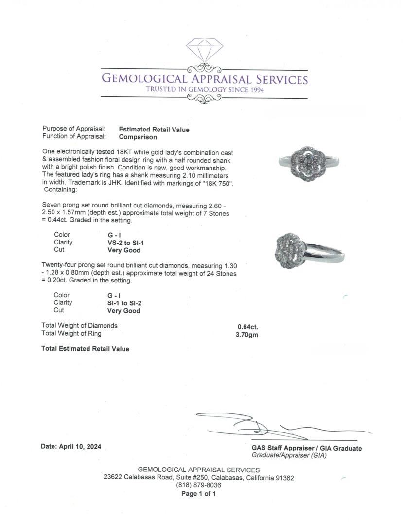 One electronically tested 18KT white gold lady's combination cast & assembled fashion floral design ring with a half rounded shank with a bright polish finish. Condition is new, good workmanship. The featured lady's ring has a shank with a bright polish f GAS Appraised.