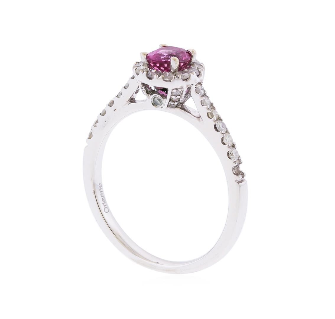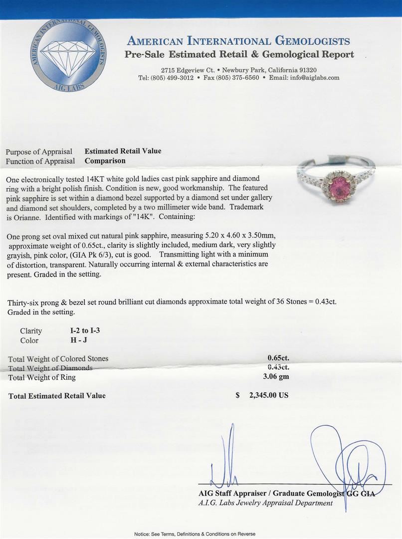 One electronically tested 14KT white gold ladies cast pink sapphire and diamond ring with a bright polish finish. The featured pink sapphire is set within a diamond bezel supported by a diamond set under gallery and diamond set shoulders, completed by a two millimeter wide band. Trademark is Orianne. Identified with markings of "14K". Condition is new, good workmanship. Containing: One prong set oval mixed cut natural pink sapphire, measuring 5.20 x 4.60 x 3.50mm, approximate weight of 0.65ct., clarity is slightly included, medium dark, very slightly grayish, pink color, (GIA Pk 6/3), cut is good. Transmitting light with a minimum of distortion, transparent. Naturally occurring internal & external characteristics are present. Graded in the setting.Thirty-Six prong & bezel set round brilliant cut diamonds approximate total weight of 36 Stones = 0.43ct. Graded in the setting. Clarity: I-2 to I-3. Color: H - J. Total Weight of Colored Stones 0.65ct. Total Weight of Diamonds 0.43ct. Total Weight of Ring 3.06gm. AIG Appraised at $2,345.00.