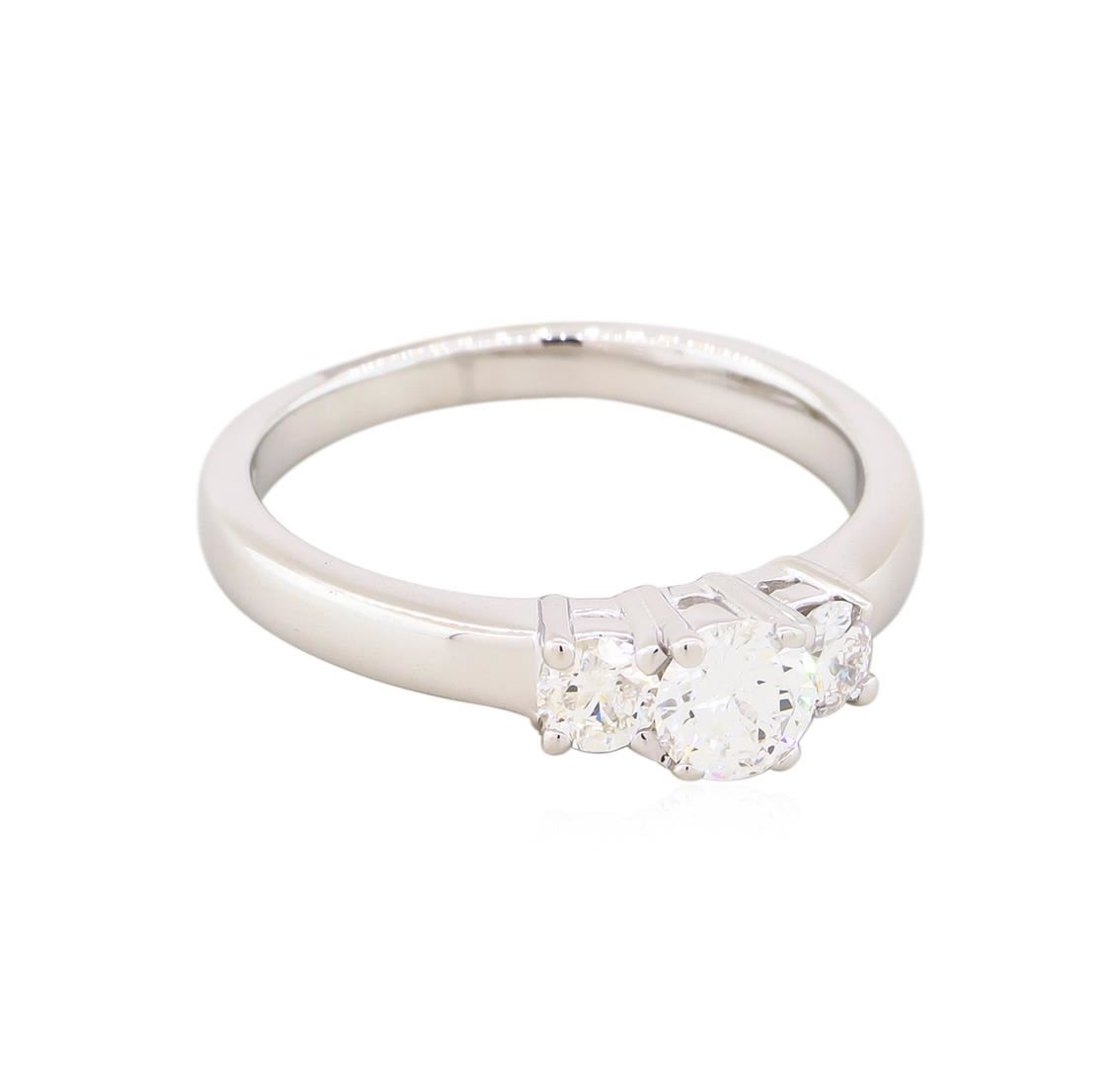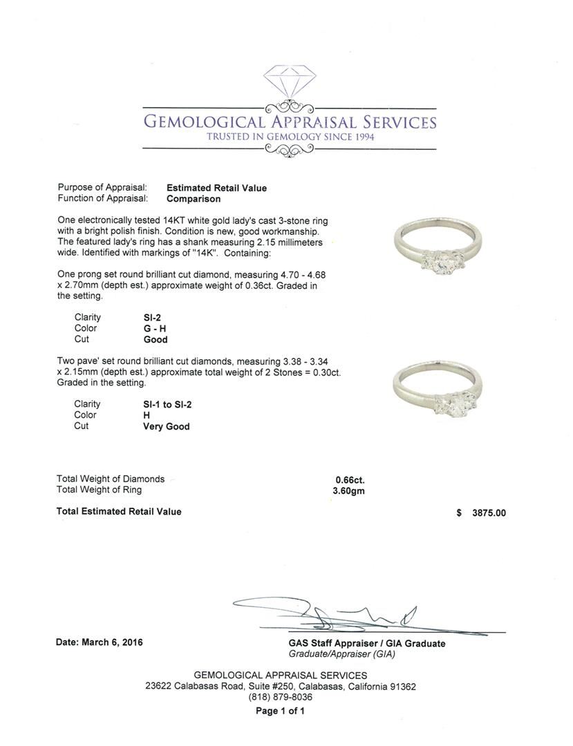 One electronically tested 14KT white gold lady's cast 3-stone ring with a bright polish finish. The featured lady's ring has a shank measuring 2.15 millimeters wide. Identified with markings of "14K". Condition is new, good workmanship. Containing: One prong set round brilliant cut diamond, measuring 4.70 - 4.68 x 2.70mm (depth est.) approximate weight of 0.36ct. Graded in the setting. Clarity: SI-2. Color: G - H, Cut Good. Two pave' set round brilliant cut diamonds, measuring 3.38 - 3.34 x 2.15mm (depth est.) approximate. Total Weight of 2 Stones = 0.30ct. Graded in the setting. Clarity: SI-1 to SI-2. Color: H, Cut Very Good. Total Weight of Diamonds 0.66ct. Total Weight of Ring 3.60gm. GAS Appraised at $3,875.00.