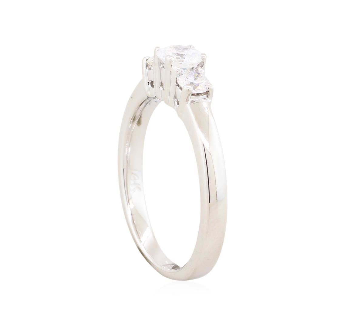 One electronically tested 14KT white gold lady's cast 3-stone ring with a bright polish finish. The featured lady's ring has a shank measuring 2.15 millimeters wide. Identified with markings of "14K". Condition is new, good workmanship. Containing: One prong set round brilliant cut diamond, measuring 4.70 - 4.68 x 2.70mm (depth est.) approximate weight of 0.36ct. Graded in the setting. Clarity: SI-2. Color: G - H, Cut Good. Two pave' set round brilliant cut diamonds, measuring 3.38 - 3.34 x 2.15mm (depth est.) approximate. Total Weight of 2 Stones = 0.30ct. Graded in the setting. Clarity: SI-1 to SI-2. Color: H, Cut Very Good. Total Weight of Diamonds 0.66ct. Total Weight of Ring 3.60gm. GAS Appraised at $3,875.00.