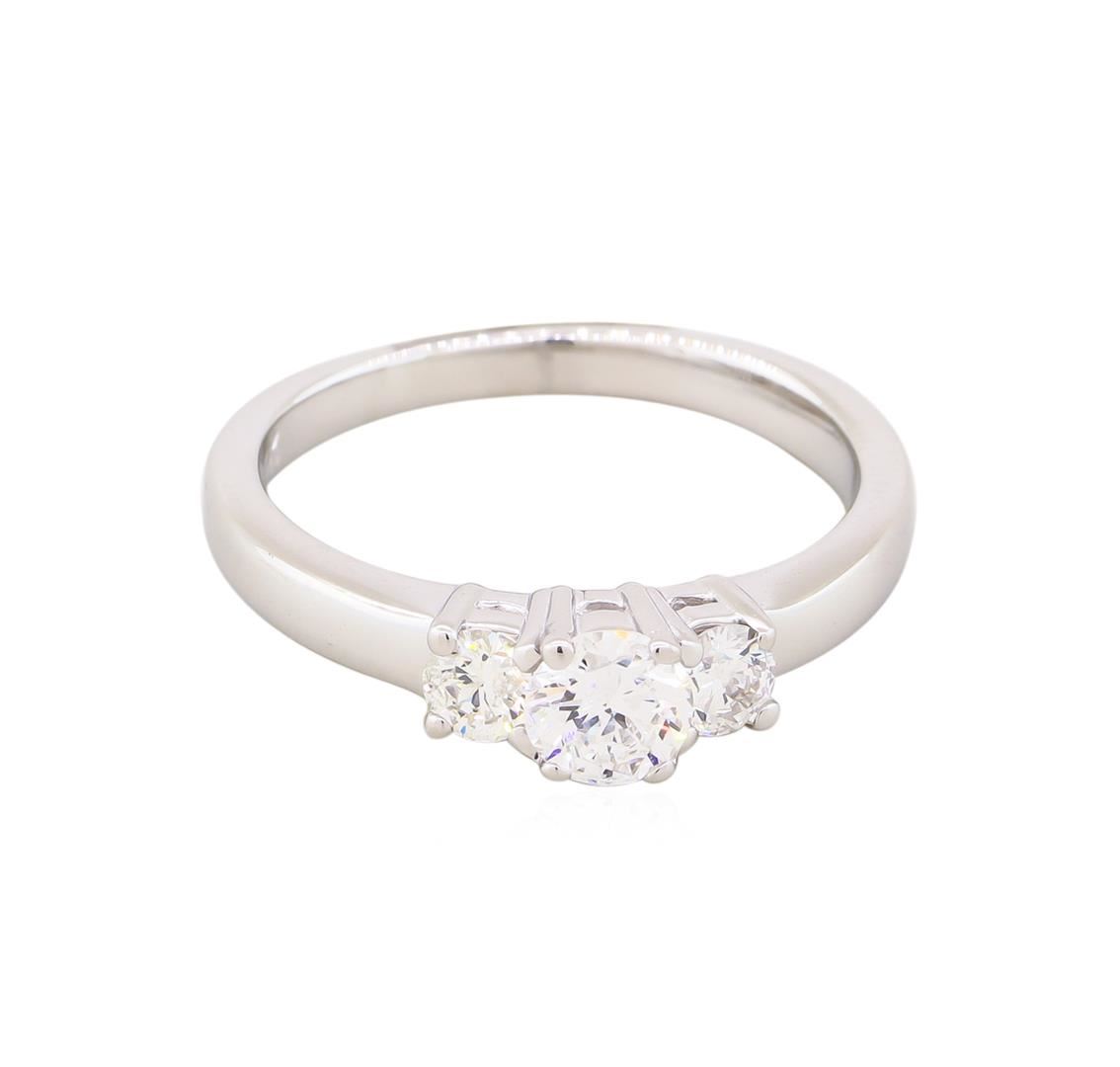 One electronically tested 14KT white gold lady's cast 3-stone ring with a bright polish finish. The featured lady's ring has a shank measuring 2.15 millimeters wide. Identified with markings of "14K". Condition is new, good workmanship. Containing: One prong set round brilliant cut diamond, measuring 4.70 - 4.68 x 2.70mm (depth est.) approximate weight of 0.36ct. Graded in the setting. Clarity: SI-2. Color: G - H, Cut Good. Two pave' set round brilliant cut diamonds, measuring 3.38 - 3.34 x 2.15mm (depth est.) approximate. Total Weight of 2 Stones = 0.30ct. Graded in the setting. Clarity: SI-1 to SI-2. Color: H, Cut Very Good. Total Weight of Diamonds 0.66ct. Total Weight of Ring 3.60gm. GAS Appraised.