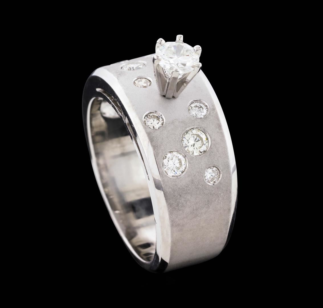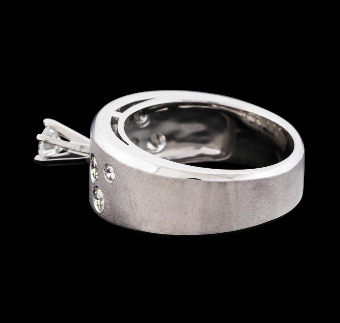 One electronically tested 14KT white gold lady's cast fashion ring with a tapered shank with a bright polish and satin finish. The featured lady's ring has a 1mm beveled edge and a shank measuring 5.64 millimeters wide. Identified with markings of "14K". Condition is new, good workmanship. Containing: One prong set round brilliant cut diamond, measuring 4.20 - 4.18 x 2.60mm (depth est.) approximate weight of 0.28ct. Graded in the setting. Clarity: SI-1. Color: HCut Good Two bezel set round brilliant cut diamonds, measuring 2.65 - 2.55 x 1.61mm (depth est.) approximate total weight of 2 Stones = 0.13ct. Graded in the setting. Clarity: SI-1 to SI-2. Color: H - ICut Good Three bezel set round brilliant cut diamonds, measuring 2.40 - 2.25 x 1.44mm (depth est.) approximate total weight of 3 Stones = 0.15ct. Graded in the setting. Clarity: VS-2 to SI-2. Color: H - ICut Good Five bezel set round brilliant cut diamonds, measuring 1.90 - 1.65 x 1.10mm (depth est.) approximate total weight of 5 Stones = 0.11ct. Graded in the setting. Clarity: SI-1 to SI-2. Color: H - ICut Good. Total Weight of Diamonds 0.67ct. Total Weight of Ring 7.90gm. GAS Appraised.