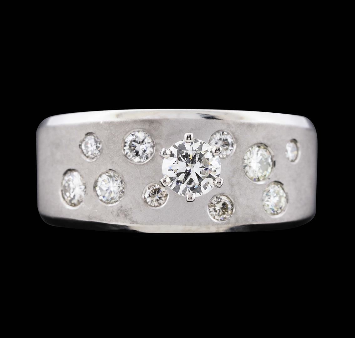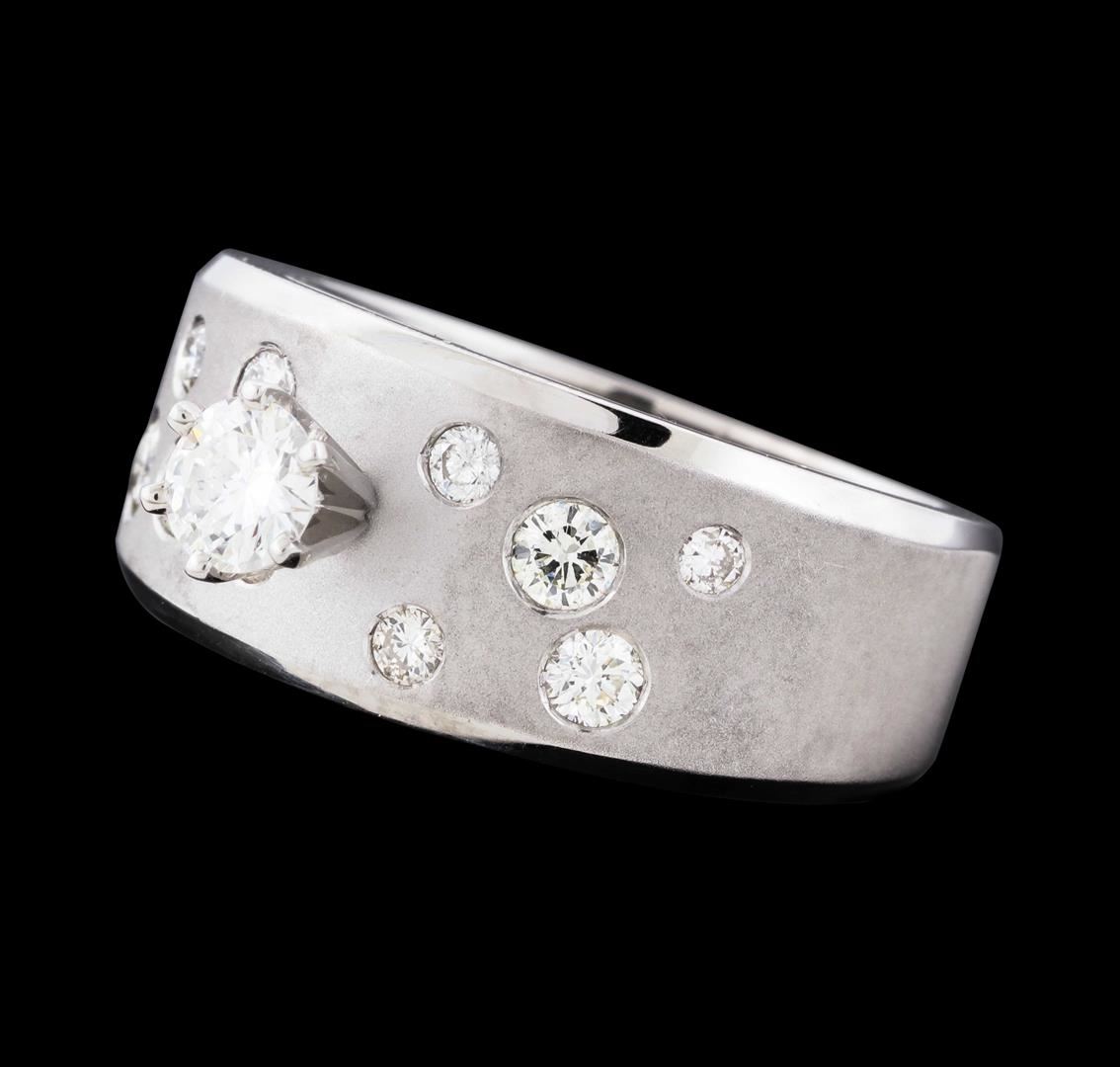 One electronically tested 14KT white gold lady's cast fashion ring with a tapered shank with a bright polish and satin finish. The featured lady's ring has a 1mm beveled edge and a shank measuring 5.64 millimeters wide. Identified with markings of "14K". Condition is new, good workmanship. Containing: One prong set round brilliant cut diamond, measuring 4.20 - 4.18 x 2.60mm (depth est.) approximate weight of 0.28ct. Graded in the setting. Clarity: SI-1. Color: HCut Good Two bezel set round brilliant cut diamonds, measuring 2.65 - 2.55 x 1.61mm (depth est.) approximate total weight of 2 Stones = 0.13ct. Graded in the setting. Clarity: SI-1 to SI-2. Color: H - ICut Good Three bezel set round brilliant cut diamonds, measuring 2.40 - 2.25 x 1.44mm (depth est.) approximate total weight of 3 Stones = 0.15ct. Graded in the setting. Clarity: VS-2 to SI-2. Color: H - ICut Good Five bezel set round brilliant cut diamonds, measuring 1.90 - 1.65 x 1.10mm (depth est.) approximate total weight of 5 Stones = 0.11ct. Graded in the setting. Clarity: SI-1 to SI-2. Color: H - ICut Good. Total Weight of Diamonds 0.67ct. Total Weight of Ring 7.90gm. GAS Appraised.