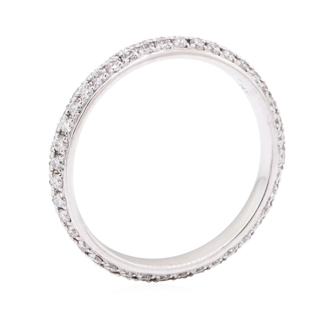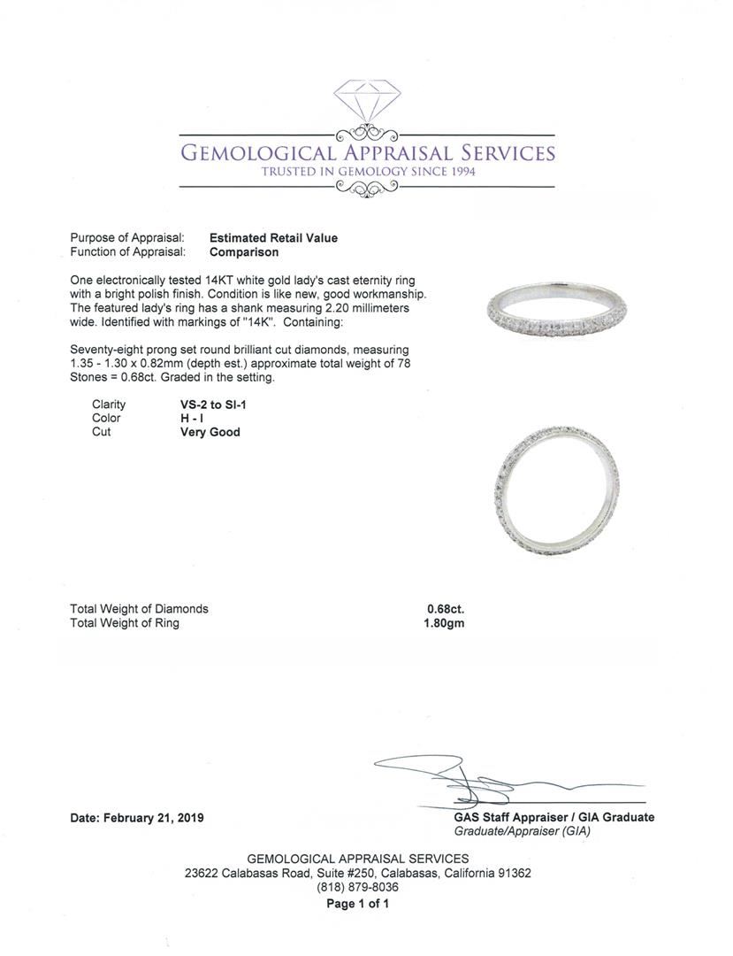 One electronically tested 14KT white gold lady's cast eternity ring with a bright polish finish. The featured lady's ring has a shank measuring 2.20 millimeters wide. Identified with markings of '14K'. Condition is like new, good workmanship. Containing: Seventy-Eight prong set round brilliant cut diamonds, measuring 1.35 - 1.30 x 0.82mm (depth est.) approximate total weight of 78 Stones = 0.68ct. Graded in the setting. Color H - I, Clarity VS-2 to SI-1, Cut Very Good. Total Weight of Diamonds 0.68ct. Total Weight of Ring 1.80gm. GAS Appraised.