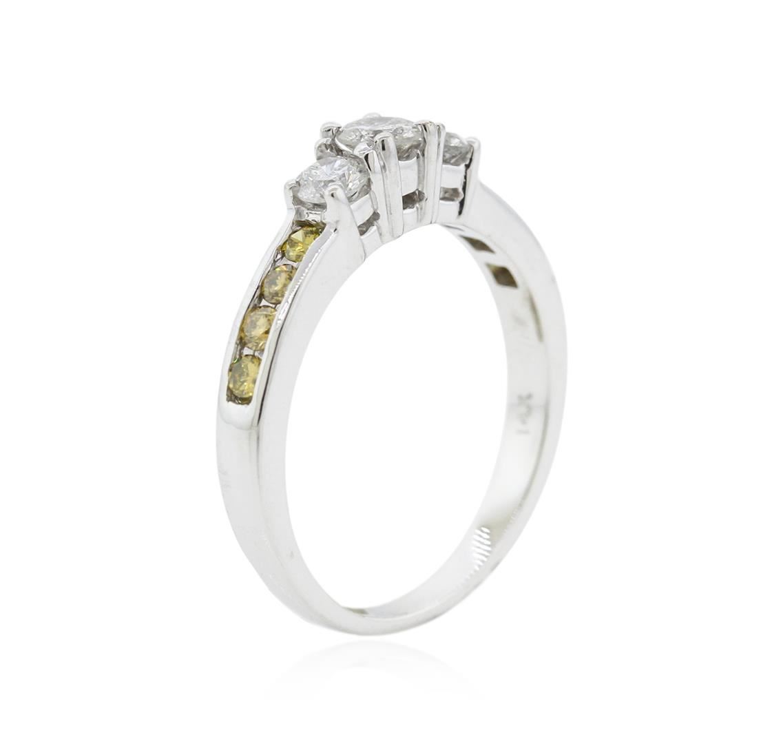 One ring featuring: 14KT white gold weighing 3.00 grams containing three primary diamonds with a total weight of 0.49ct and eight yellow diamonds with a total weight of 0.25ct.