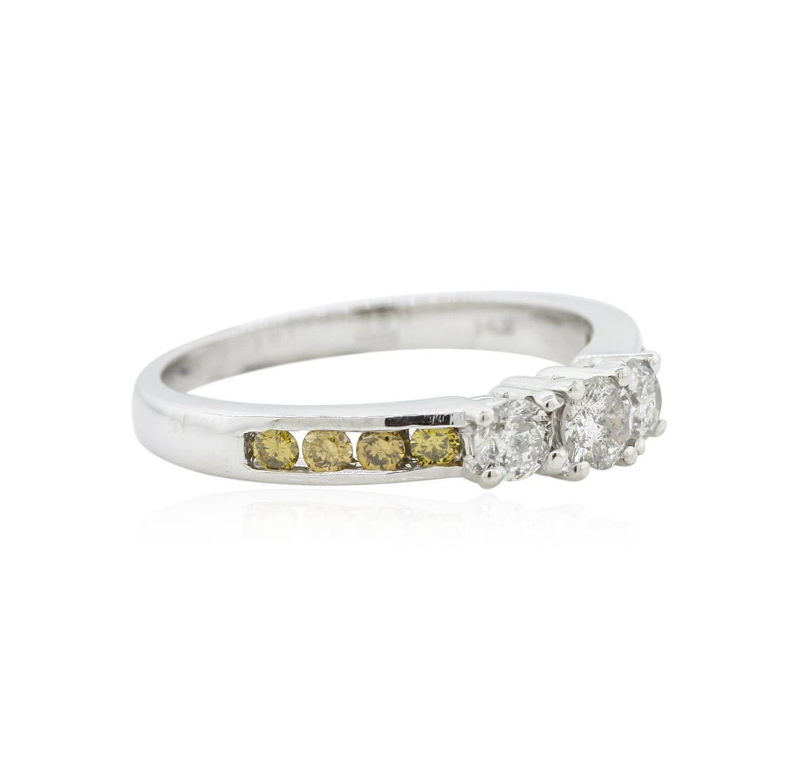 One ring featuring: 14KT white gold weighing 3.00 grams containing three primary diamonds with a total weight of 0.49ct and eight yellow diamonds with a total weight of 0.25ct.