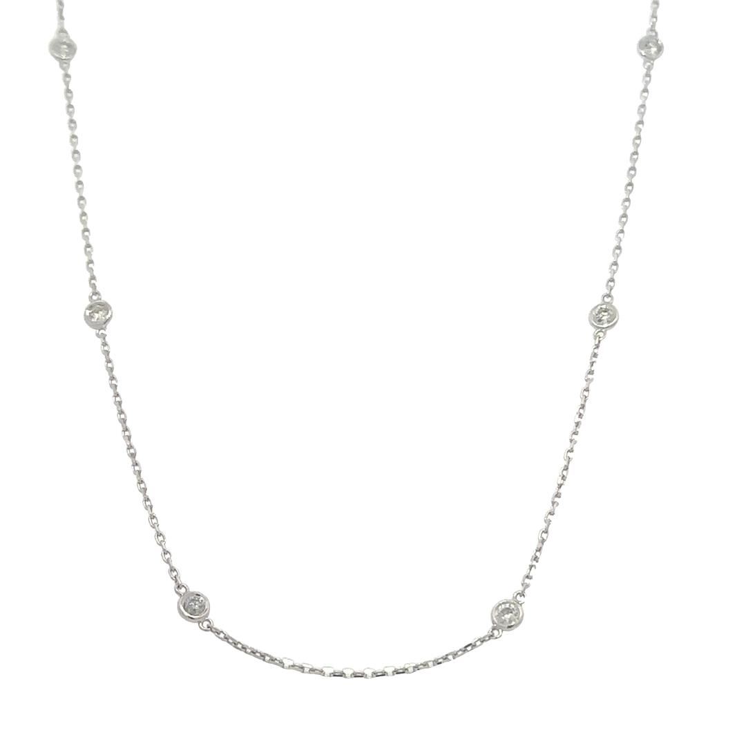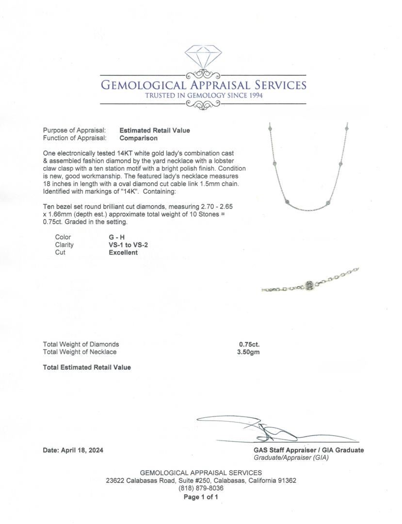 One electronically tested 14KT white gold lady's combination cast & assembled fashion diamond by the yard necklace with a lobster claw clasp with a ten station motif with a bright polish finish. Condition is new, good workmanship. The featured lady's neck GAS Appraised.