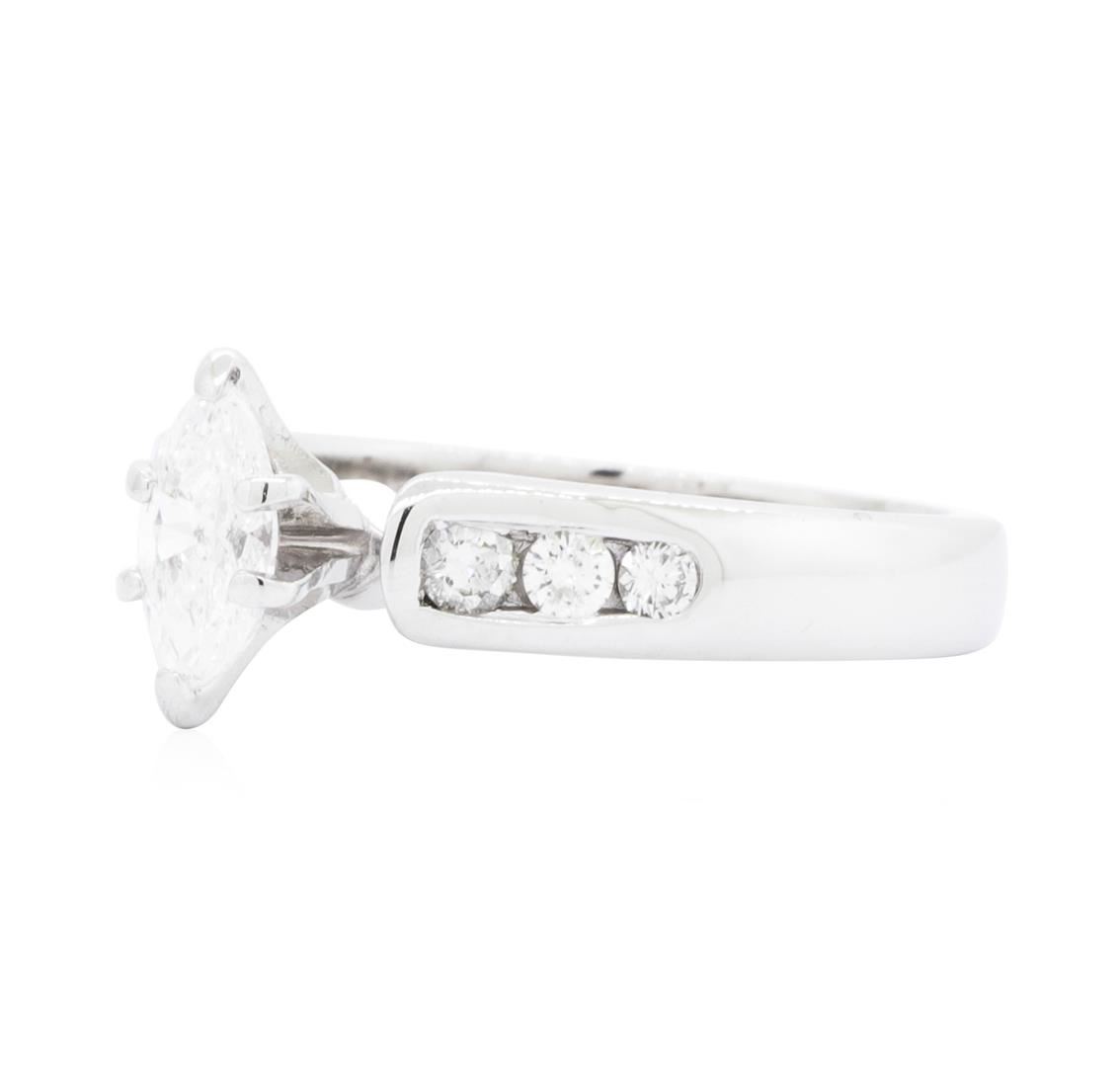 One electronically tested 14KT white gold Ladies cast wedding ring with a bright polish finish. The featured Ladies ring has a shank measuring 2.75 millimeters wide. Identified with markings of '14K'. Condition is new, good workmanship. Containing: One prong set marquise shaped cut diamond, measuring 7.00 x 4.00 x 2.60mm (depth est.) approximate weight of 0.47ct. Graded in the setting. Color H Clarity VS-2 Cut Very Good Six channel set round brilliant cut diamonds, measuring 2.40 - 1.90 x 1.33mm (depth est.) approximate total weight of 6 Stones = 0.28ct. Graded in the setting. Color H - I Clarity SI-1 to SI-2 Cut Good. Total Weight of Diamonds 0.75ct. Total Weight of Ring 4.70gm. GAS Appraised.