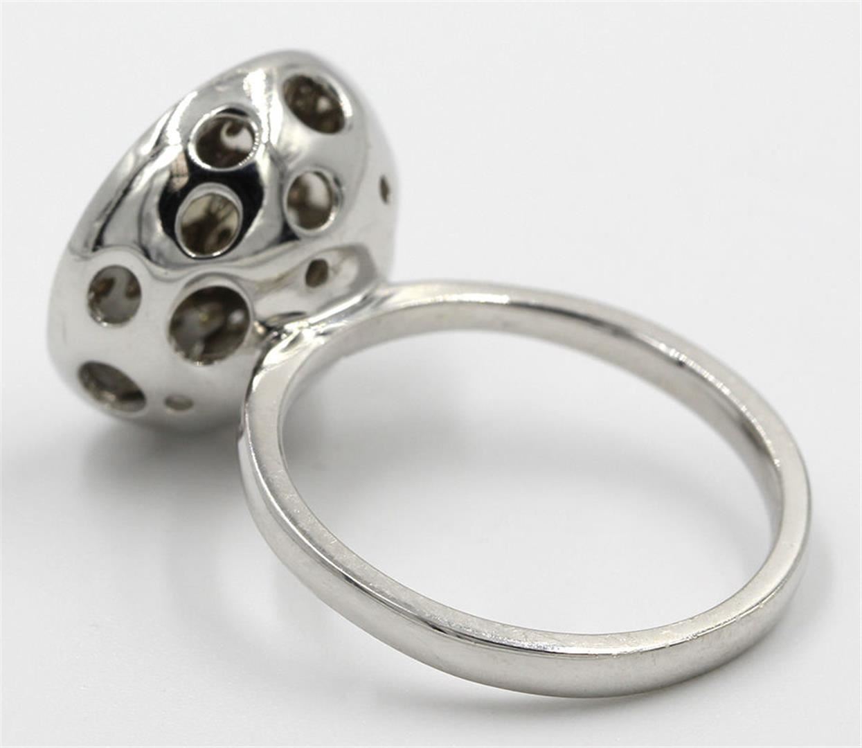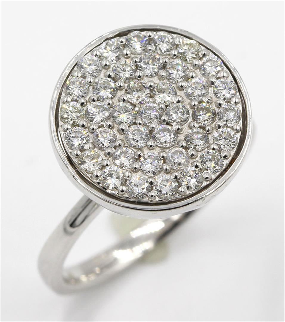One Round Cut Diamond Dome Anniversary Ring in 14k White Gold. Gross weight of ring is 4.85 grams. Main stone is 0.75 carats and natural / non-enhanced. Main stone clarity is VS2 - SI1, color G, shape brilliant round cut, and is size 6.25 but can be resized free of charge with a total of 37 stones.