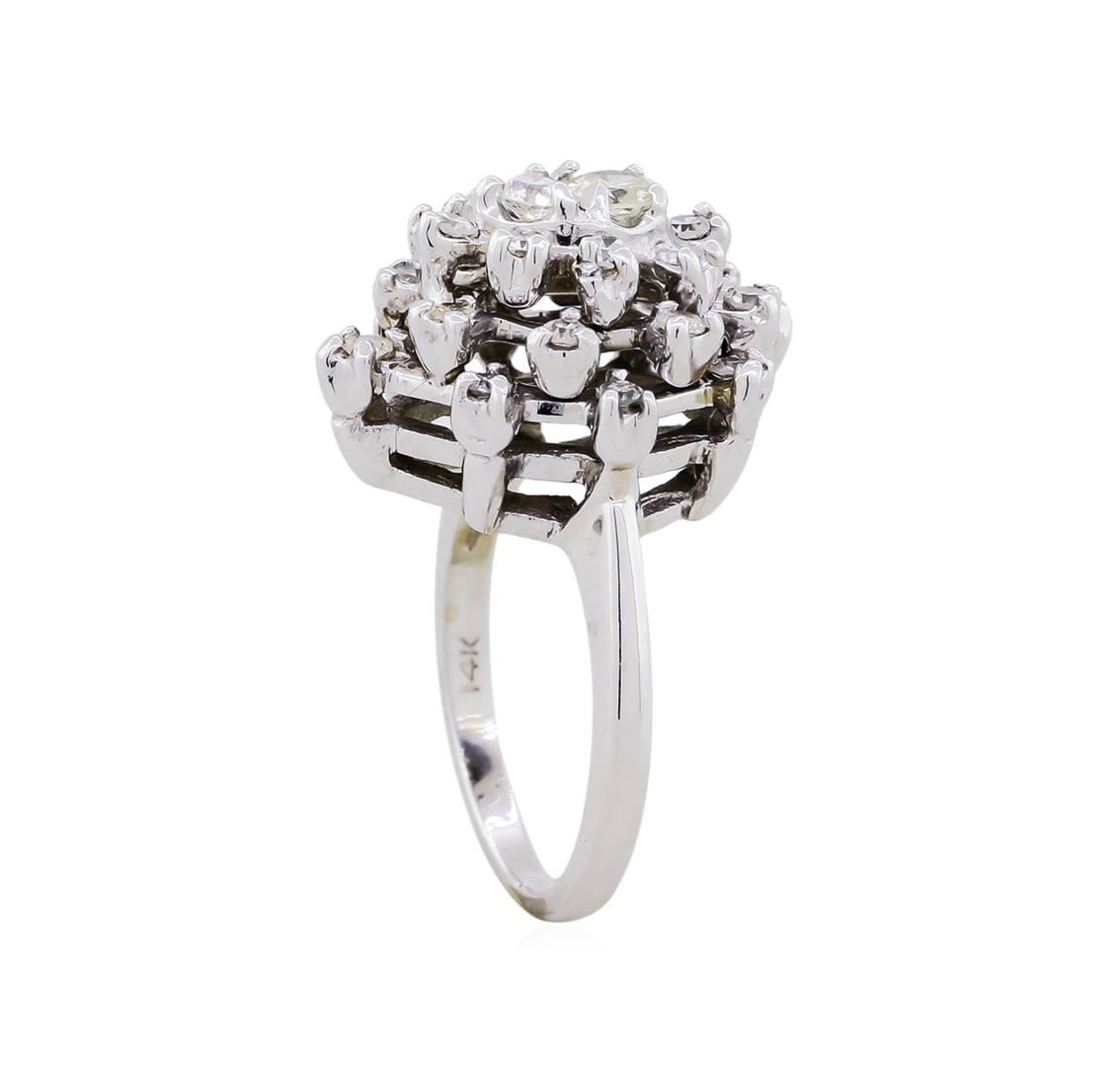 One electronically tested 14KT white gold ladies cast diamond cluster ring. The featured diamond cluster is completed by a one and one half millimeter wide band. Bright polish finish. Identified with markings of "14K". Condition is new, good workmanship. Containing: One prong set round brilliant cut diamond, measuring 3.50 - 3.50 x 1.95mm (depth est.) approximate weight of 0.15ct. Graded in the setting. Clarity: I-1. Color: M One prong set Old European cut diamond, measuring 2.60 - 2.50 x 1.58mm (depth est.) approximate weight of 0.10ct. Graded in the setting. Clarity: SI-2. Color: H Twenty-Four prong set single cut diamonds, measuring 2.00 - 1.70 x 1.02mm (depth est.) approximate. Total Weight of 24 Stones = 0.50ct. Graded in the setting. Clarity: SI-1 to SI-2. Color: H - J. Total Weight of Diamonds 0.75ct. AIG Appraised at $3,625.00.