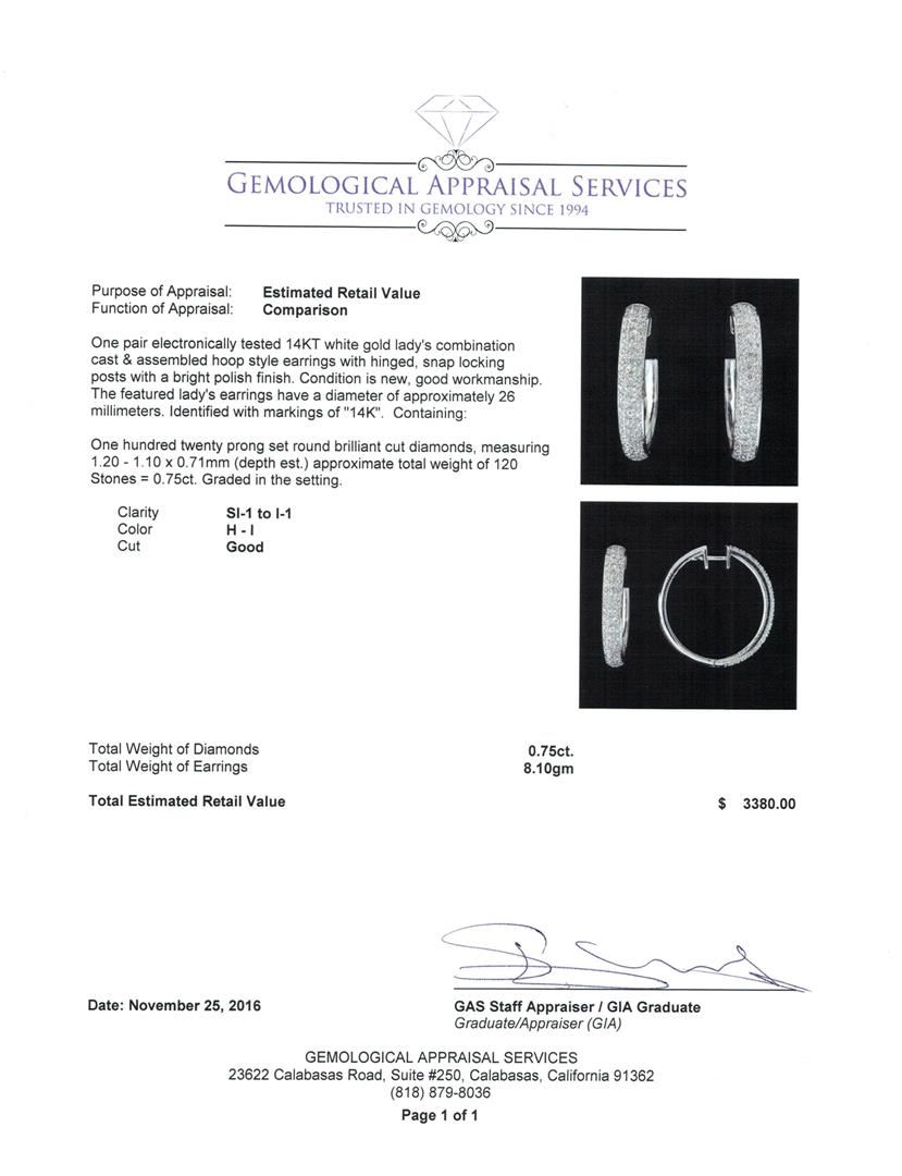 One pair electronically tested 14KT white gold lady's combination cast & assembled hoop style earrings with hinged, snap locking posts with a bright polish finish. The featured lady's earrings have a diameter of approximately 26 millimeters. Identified with markings of "14K". Condition is new, good workmanship. Containing: One Hundred Twenty prong set round brilliant cut diamonds, measuring 1.20 - 1.10 x 0.71mm (depth est.) approximate total weight of 120 Stones = 0.75ct. Graded in the setting. Clarity: SI-1 to I-1. Color: H - ICut Good. Total Weight of Diamonds 0.75ct. Total Weight of Earrings 8.10gm. GAS Appraised at $3,380.00.