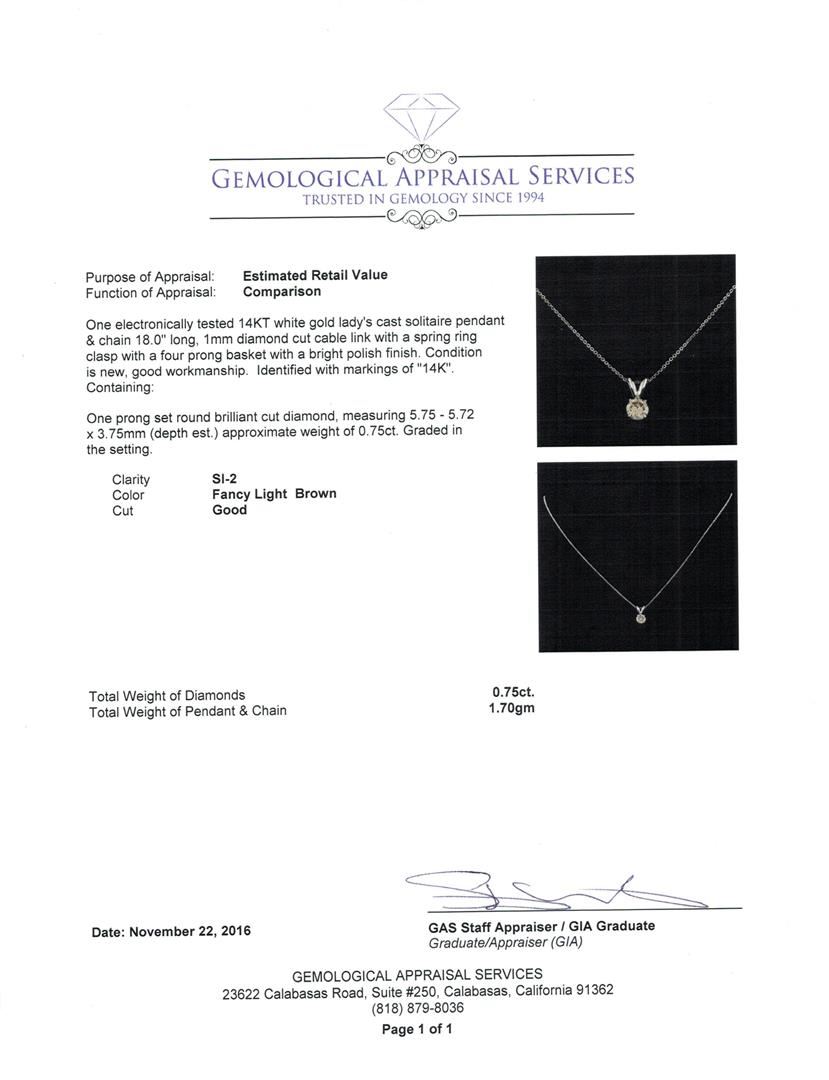 One electronically tested 14KT white gold lady's cast solitaire pendant & chain 18.0" long, 1mm diamond cut cable link with a spring ring clasp with a four prong basket with a bright polish finish. Identified with markings of "14K". Condition is new, good workmanship. Containing: One prong set round brilliant cut diamond, measuring 5.75 - 5.72 x 3.75mm (depth est.) approximate weight of 0.75ct. Graded in the setting. Clarity: SI-2. Color: U - VCut Good. Total Weight of Diamonds 0.75ct. Total Weight of Pendant & Chain 1.70gm. GAS Appraised.