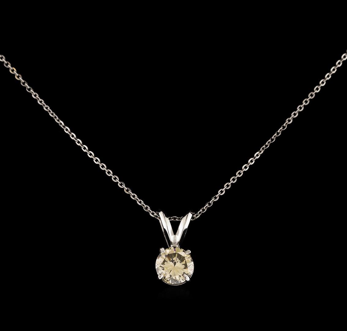One electronically tested 14KT white gold lady's cast solitaire pendant & chain 18.0" long, 1mm diamond cut cable link with a spring ring clasp with a four prong basket with a bright polish finish. Identified with markings of "14K". Condition is new, good workmanship. Containing: One prong set round brilliant cut diamond, measuring 5.75 - 5.72 x 3.75mm (depth est.) approximate weight of 0.75ct. Graded in the setting. Clarity: SI-2. Color: U - VCut Good. Total Weight of Diamonds 0.75ct. Total Weight of Pendant & Chain 1.70gm. GAS Appraised.
