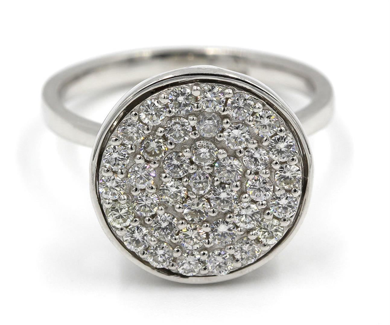 One Round Cut Diamond Dome Anniversary Ring in 14k White Gold. Gross weight of ring is 4.85 grams. Main stone is 0.75 carats and natural / non-enhanced. Main stone clarity is VS2 - SI1, color G, shape brilliant round cut, and is size 6.25 but can be resized free of charge with a total of 37 stones.