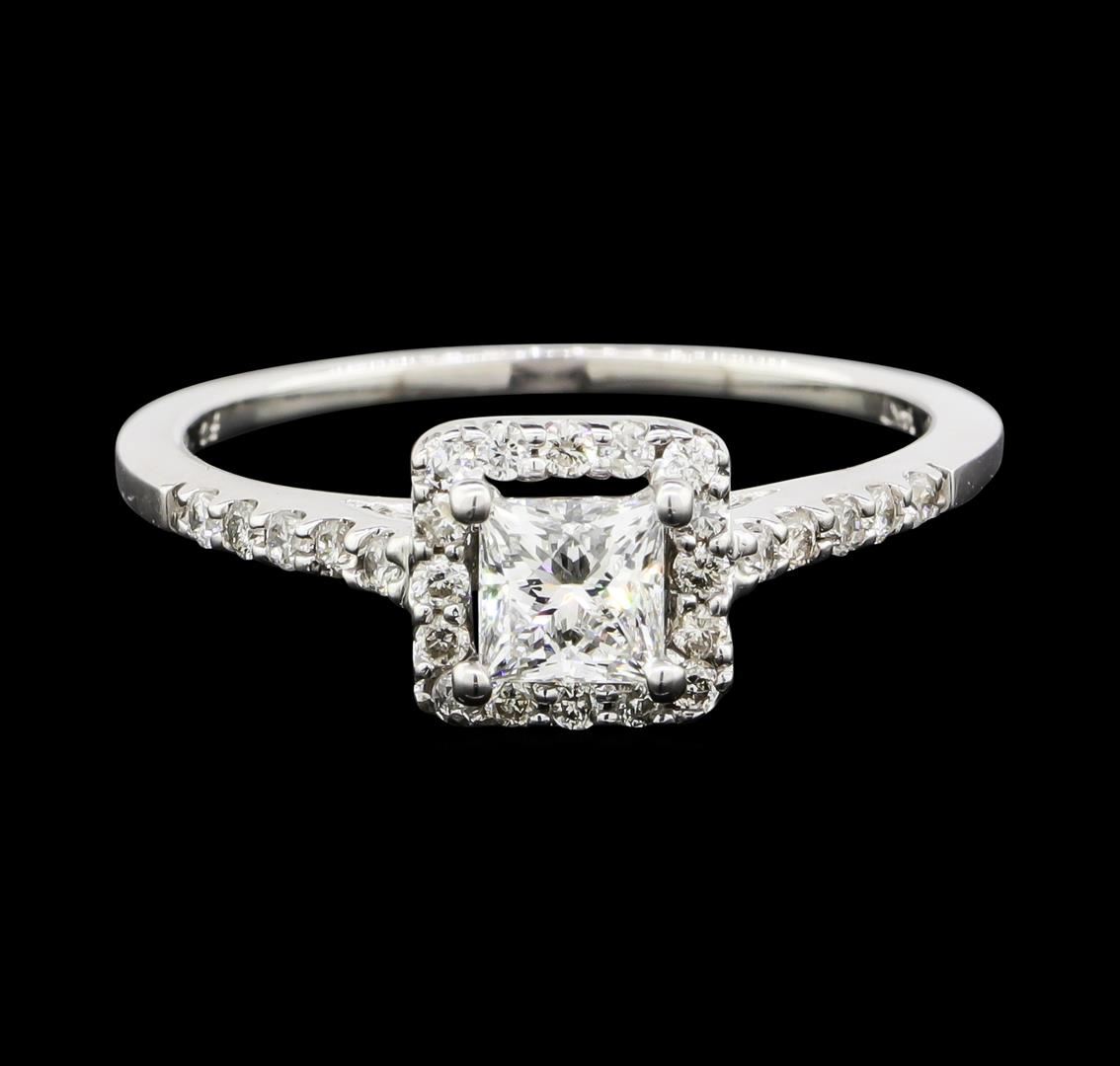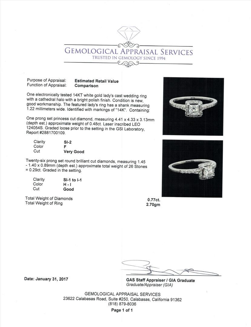 One electronically tested 14KT white gold lady's cast wedding ring with a cathedral halo with a bright polish finish. The featured lady's ring has a shank measuring 1.22 millimeters wide. Identified with markings of "14K". Condition is new, good workmanship. Containing: One prong set princess cut diamond, measuring 4.41 x 4.33 x 3.13mm (depth est.) approximate weight of 0.48ct. Laser inscribed LEO 124054S. Graded loose prior to the setting in the GSI Laboratory, Report #2881700109. Clarity: SI-2. Color: FCut Very Good Twenty-Six prong set round brilliant cut diamonds, measuring 1.45 - 1.40 x 0.89mm (depth est.) approximate total weight of 26 Stones = 0.29ct. Graded in the setting. Clarity: SI-1 to I-1. Color: H - ICut Good. Total Weight of Diamonds 0.77ct. Total Weight of Ring 2.70gm. GAS Appraised.