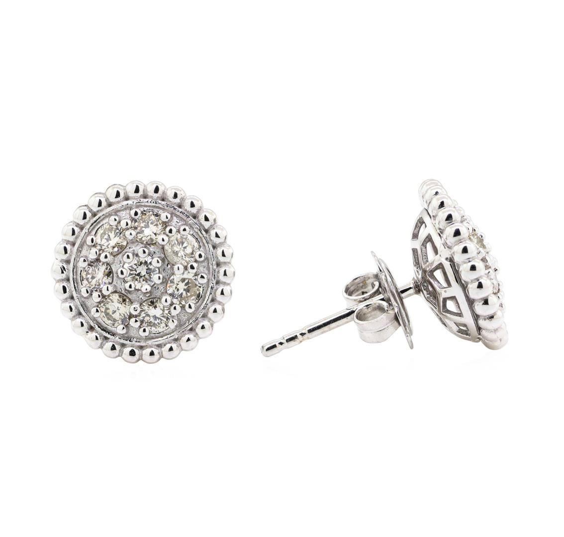 One pair electronically tested 14KT white gold Ladies combination cast & assembled fashion dome style earrings with friction posts with a bright polish finish. The featured Ladies earrings have a beaded accent halo motif. Identified with markings of '14K'. Condition is new, good workmanship. Containing: Sixteen prong set round brilliant cut diamonds, measuring 2.40 - 2.30 x 1.46mm (depth est.) approximate total weight of 16 Stones = 0.78ct. Graded in the setting. Color I - J Clarity VS-2 to SI-1 Cut Good. Total Weight of Diamonds 0.78ct.. Total Weight of Earrings 4.30gm. GAS Appraised.