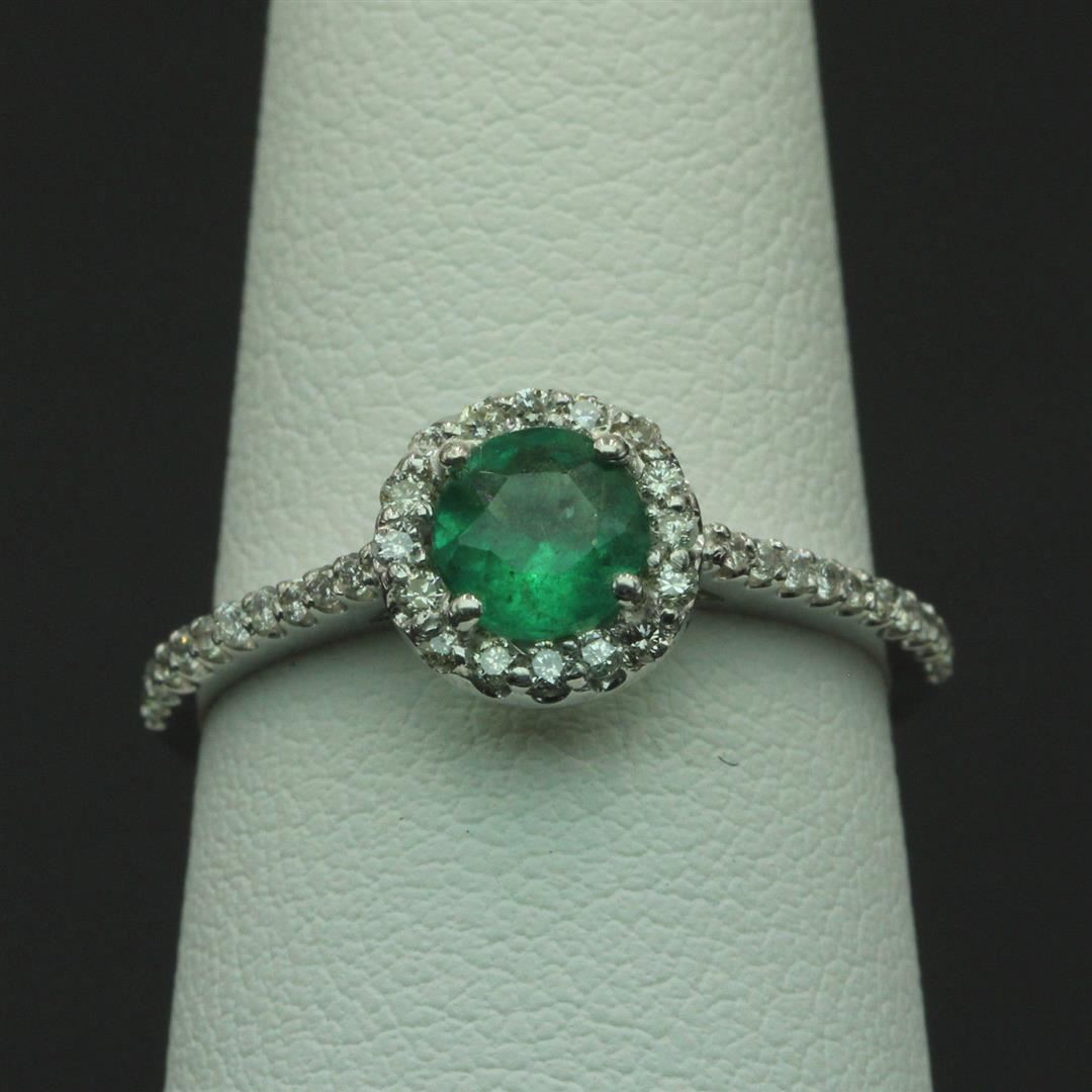 One Natural Emerald Round Cut Diamond Solitaire Engagement Wedding Ring in 14k White Gold. Total carat weight is 0.78 carats. Gross weight is 1.75 grams with a total of 39 diamonds. Size is 6.25 and can be resized free of charge. Condition is brand new. Main stone is non-enhanced and natural. Main diamond carat is 0.57 carats, shape brilliant round cut, clarity good, color emerald, and main diamond cut is excellent. Side stone is natural and non-enhanced. Side diamonds total carat weight is 0.21 carats, shape is round cut, clarity SI-1, color G, cut is Good, and number of side diamonds is 38.