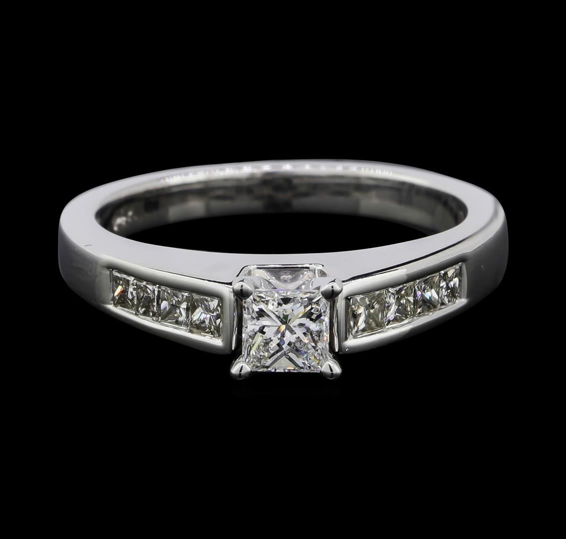 One electronically tested 14KT white gold lady's cast wedding ring with a cathedral shank with a bright polish finish. The featured lady's ring has a shank measuring 2.42 millimeters wide. Identified with markings of "14K". Condition is new, good workmanship. Containing: One prong set princess cut diamond, measuring 3.95 x 3.75 x 2.74mm (depth est.) approximate weight of 0.33ct. Clarity: SI-2. Color: GCut Very Good Eight channel set princess cut diamonds, measuring 2.20 x 2.00 x 1.50mm (depth est.) approximate total weight of 8 Stones = 0.45ct. Graded in the setting. Clarity: SI-1 to SI-2. Color: G - HCut Good. Total Weight of Diamonds 0.78ct. Total Weight of Ring 5.00gm. GAS Appraised.