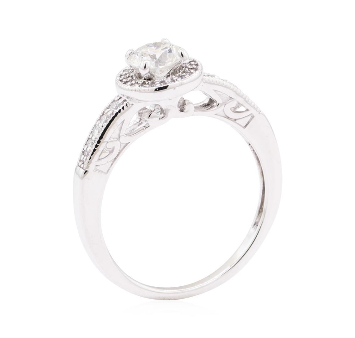 One electronically tested 14KT white gold lady's cast wedding ring with a cathedral halo with a bright polish with milgrain detailing finish. The featured lady's ring has a shank measuring 1.55 millimeters wide. Condition is like new, good workmanship. Containing: One prong set round brilliant cut diamond, measuring 5.45 - 5.40 x 3.37mm (depth est.) , 5.00.%. GTCF approximate weight of 0.65ct. Graded in the setting. Color K - L, Clarity SI-2, Cut Very Good Six prong set round brilliant cut diamonds, measuring 1.30 - 1.25 x 0.79mm (depth est.) approximate total weight of 6 Stones = 0.05ct. Graded in the setting. Color G - H, Clarity SI-1 to SI-2 Cut Good Twenty-Four prong set round brilliant cut diamonds, measuring 1.00 - 0.95 x 0.61mm (depth est.) approximate total weight of 24 Stones = 0.09ct. Graded in the setting. Color H - I, Clarity SI-1 to SI-2 Cut Good. Total Weight of Diamonds 0.79ct. Total Weight of Ring 3.70gm. GAS Appraised.