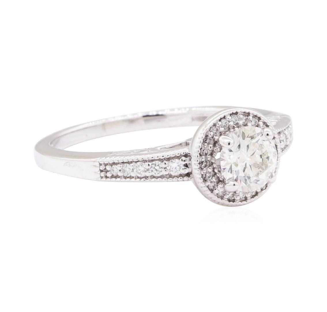 One electronically tested 14KT white gold lady's cast wedding ring with a cathedral halo with a bright polish with milgrain detailing finish. The featured lady's ring has a shank measuring 1.55 millimeters wide. Condition is like new, good workmanship. Containing: One prong set round brilliant cut diamond, measuring 5.45 - 5.40 x 3.37mm (depth est.) , 5.00.%. GTCF approximate weight of 0.65ct. Graded in the setting. Color K - L, Clarity SI-2, Cut Very Good Six prong set round brilliant cut diamonds, measuring 1.30 - 1.25 x 0.79mm (depth est.) approximate total weight of 6 Stones = 0.05ct. Graded in the setting. Color G - H, Clarity SI-1 to SI-2 Cut Good Twenty-Four prong set round brilliant cut diamonds, measuring 1.00 - 0.95 x 0.61mm (depth est.) approximate total weight of 24 Stones = 0.09ct. Graded in the setting. Color H - I, Clarity SI-1 to SI-2 Cut Good. Total Weight of Diamonds 0.79ct. Total Weight of Ring 3.70gm. GAS Appraised.