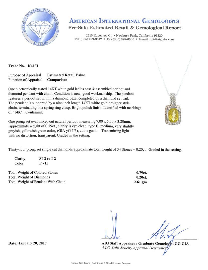 One electronically tested 14KT white gold ladies cast & assembled peridot and diamond pendant with chain. The pendant features a peridot set within a diamond bezel completed by a diamond set bail. The pendant is supported by a nine inch length 14KT white gold designer style chain, terminating in a spring ring clasp. Bright polish finish. Identified with markings of "14K". Condition is new, good workmanship. Containing: One prong set oval mixed cut natural peridot, measuring 7.00 x 5.00 x 3.20mm, approximate weight of 0.79ct., clarity is eye clean, type II, medium, very slightly grayish, yellowish green color, (GIA yG 5/3), cut is good. Transmitting light with no distortion, transparent. Graded in the setting.Thirty-Four prong set single cut diamonds approximate total weight of 34 Stones = 0.20ct. Graded in the setting. Clarity: SI-2 to I-2. Color: F - H. Total Weight of Colored Stones 0.79ct. Total Weight of Diamonds 0.20ct. Total Weight of Pendant With Chain 2.61gm. AIG Appraised.