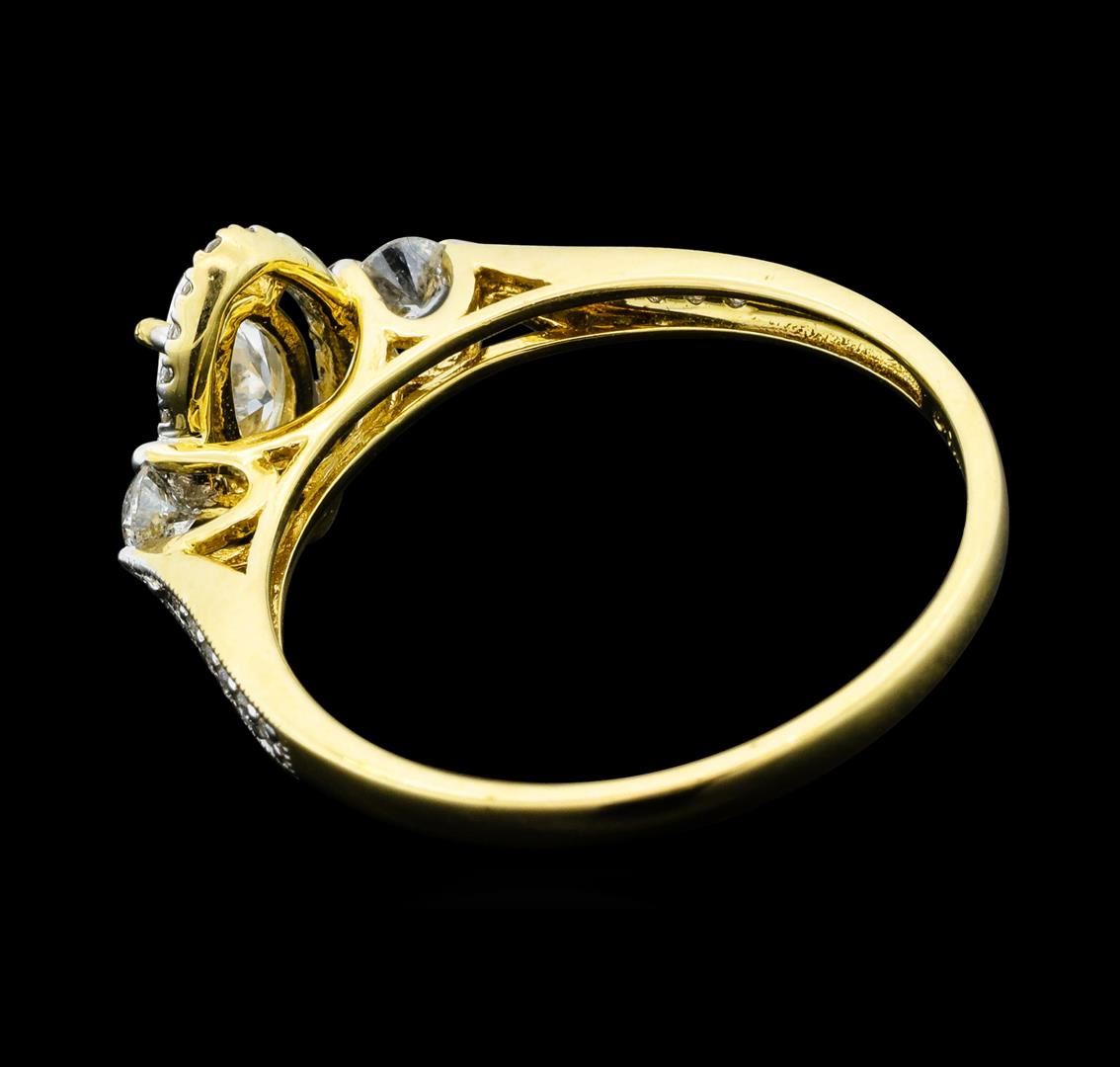 One electronically tested 14KT yellow gold ladies cast diamond unity ring. The featured diamond is set within a diamond bezel supported by mirroring diamond set shoulders, completed by a one millimeter wide band. Bright polish finish with milgrain detailing and rhodium accents. Trademark is Orianne. Identified with markings of "14K". Condition is new, good workmanship. Containing: One prong set marquise shaped cut diamond, measuring 7.07 x 4.26 x 2.59mm exact weight 0.48ct with a medium blue fluorescence. Graded loose prior to setting in the EGL Platinum Laboratory Report # 1562051121. Clarity: SI-1. Color: DDepth 60.8%. Table 61.0%. Pavil. Depth%. 40.0%. Two prong set round brilliant cut diamonds, measuring 2.70 - 2.70 x 1.62mm (depth est.) approximate total weight of 2 Stones = 0.16ct. Graded in the setting. Clarity: SI-2 to I-1. Color: E Thirty-Four prong set round brilliant cut diamonds, measuring 1.00 - 1.00 x 0.60mm (depth est.) approximate total weight of 34 Stones = 0.15ct. Measurements are an average for the group. Graded in the setting. Clarity: SI-1 to I-1. Color: E - G. Total Weight of Diamonds 0.79ct. Total Weight of Ring 2.02gm. AIG Appraised.