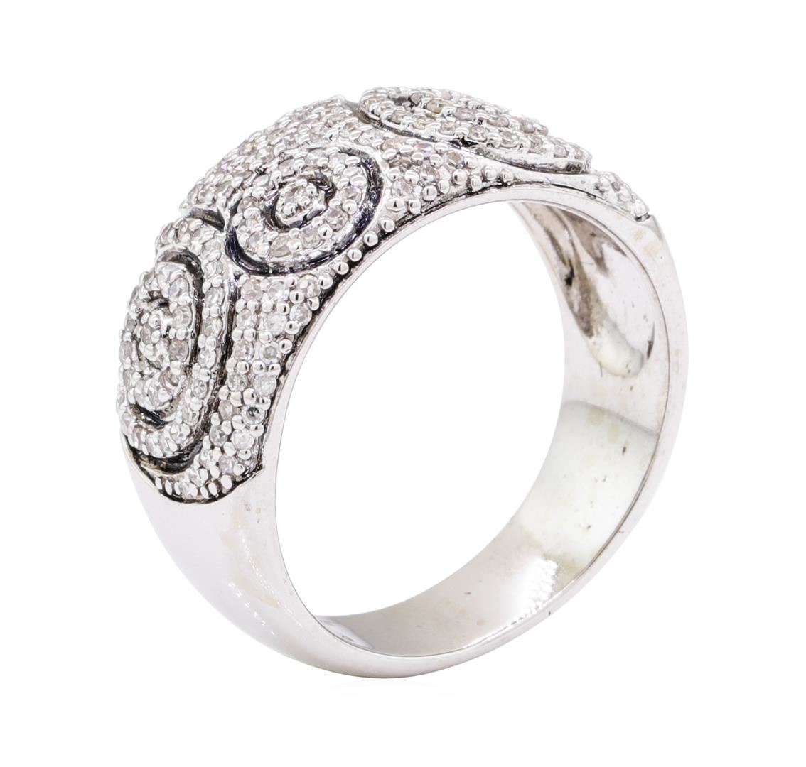 One wide band with circle motif ring featuring: 14KT white gold with black antiquing weighing 6.6 grams containing diamonds weighing 0.80ctw. The ring is a size 7.5.