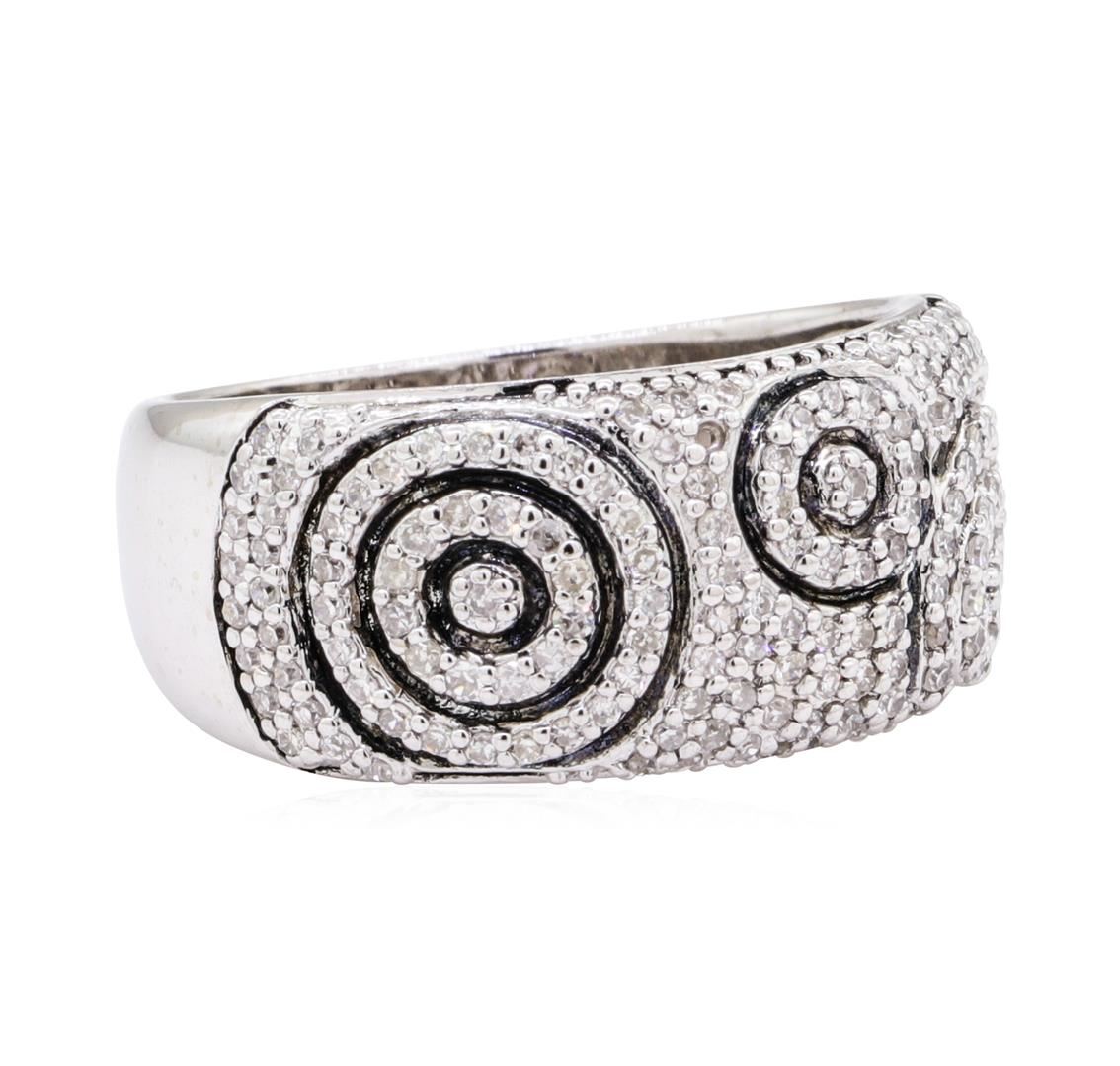 One wide band with circle motif ring featuring: 14KT white gold with black antiquing weighing 6.6 grams containing diamonds weighing 0.80ctw. The ring is a size 7.5.