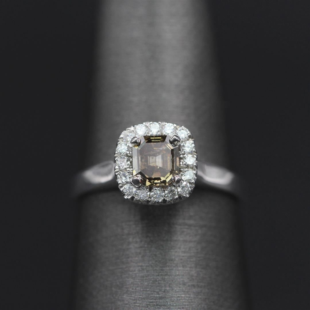 One Natural Emerald Diamond Solitaire Engagement Wedding Ring in 14k White Gold. Total carat weight is 0.80 carats. Gross weight is 2.85 grams with a total of 19 diamonds. Ring is sized at 5.75 but can be resized free of charge. Condition is brand new. The main stone is non-enhanced and natural. Main stone is 0.59 carats with brilliant round cut shape. Main diamond clarity is VS2, color cognac, and cut is excellent. Side stone is non-enhanced and natural. Side diamond is 0.21 carats, shape is brilliant round cut, clarity is SI1, color G, and cut is excellent.